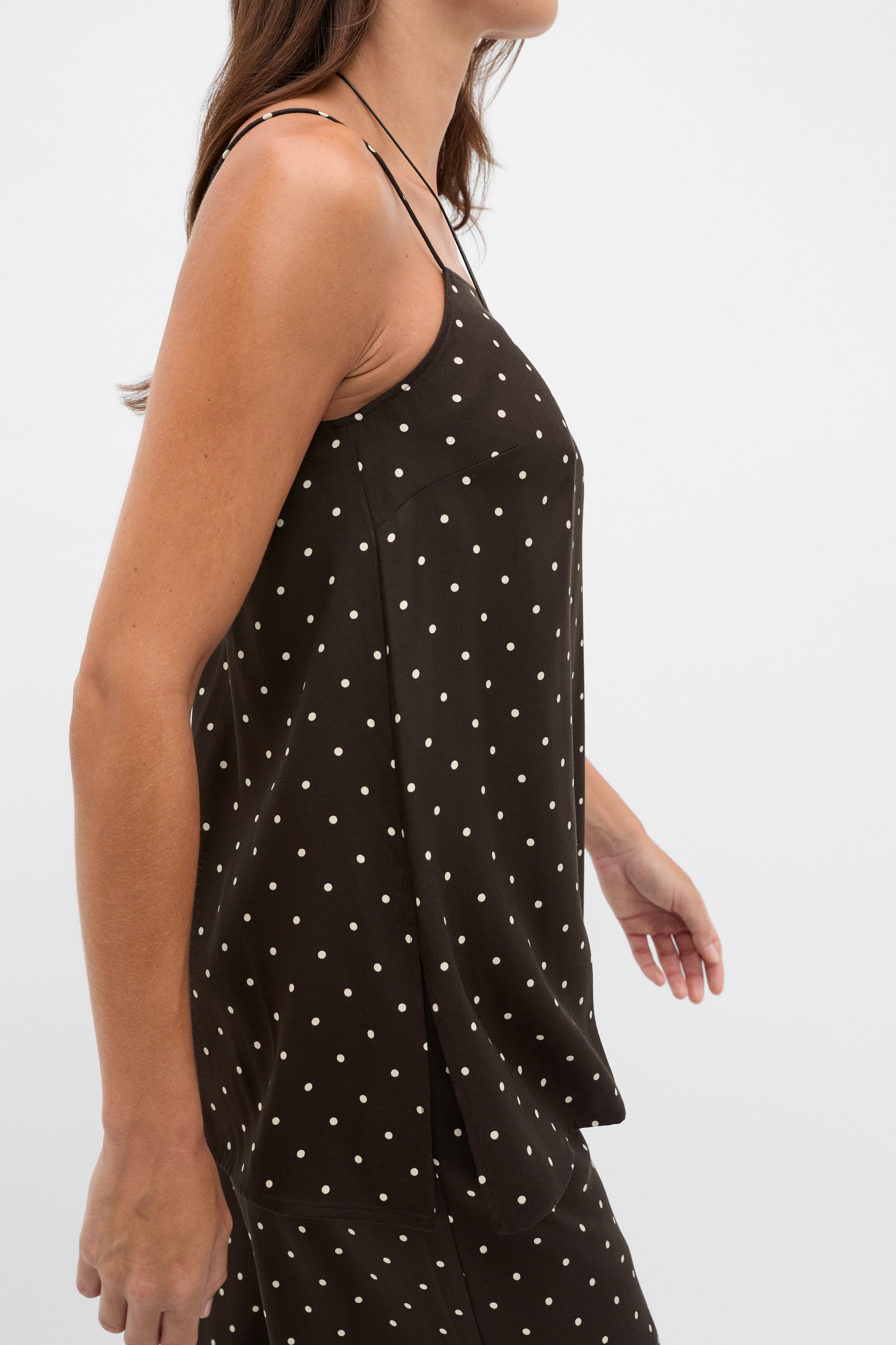 Elevate your everyday style with this longline cami, finished in a statment polka dot print. Crafted in viscose with a lightweight feel, it's perfect to layer featuring a straight neckline, slim straps and a longline cut with side splits. Secures with an invisible zip at the side.
