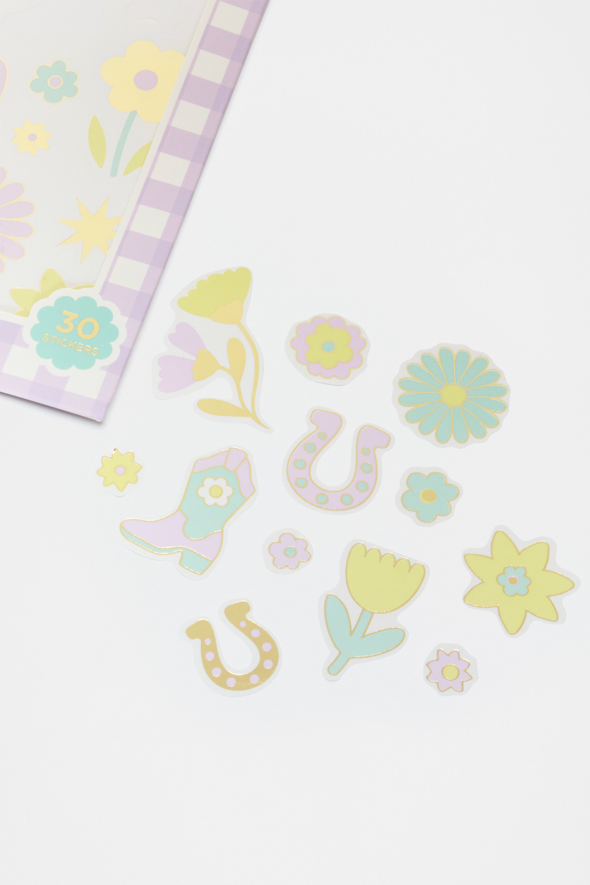 Designed to match our apparel and accessories, this sticker set is packed with western charm. Stickers include horse shoes, flowers and more.