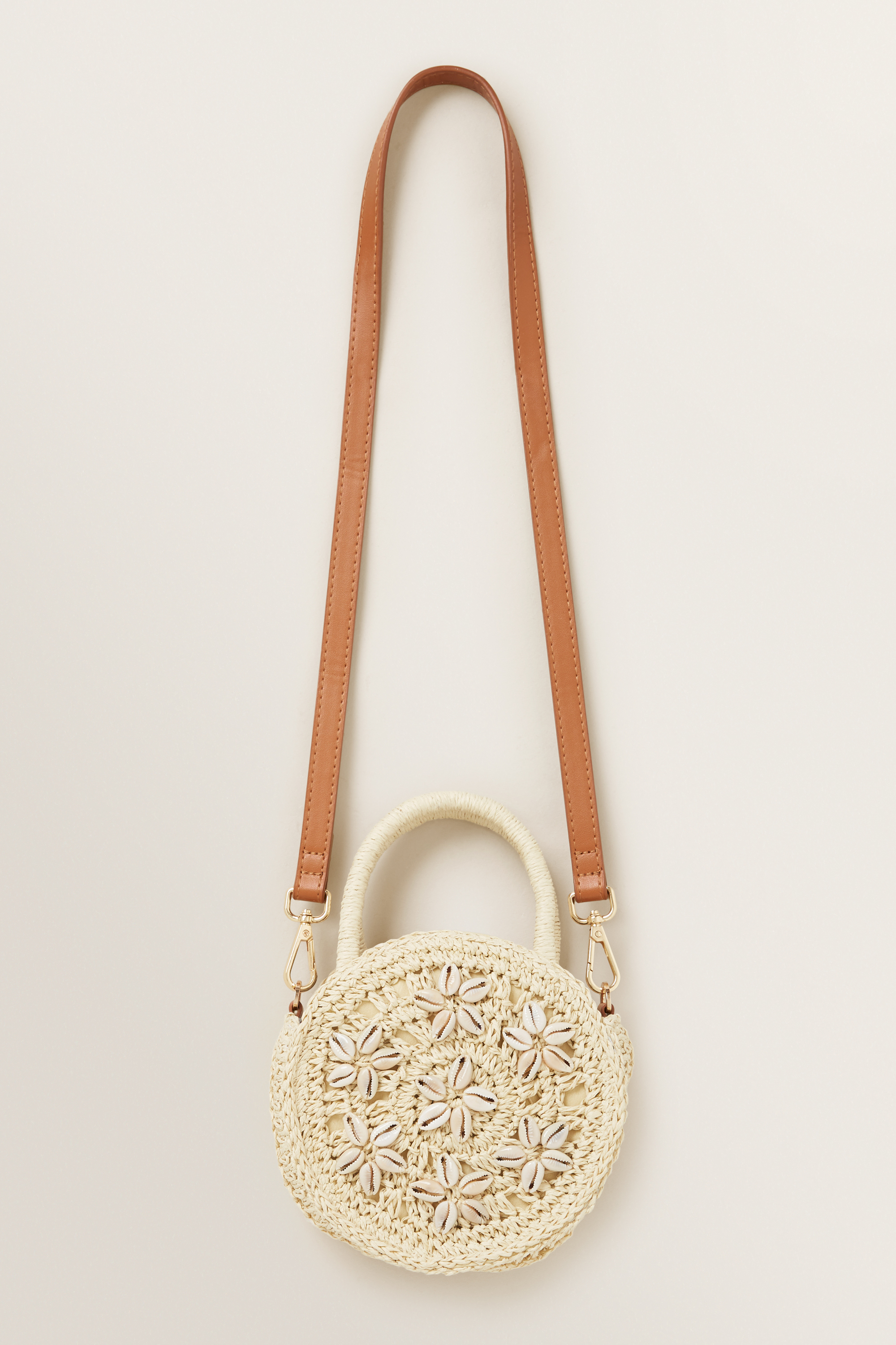 Designed from a 100% paper straw fabrication, this Straw Circle Bag is detailed with top handles, top closure and sweet floral motifs.