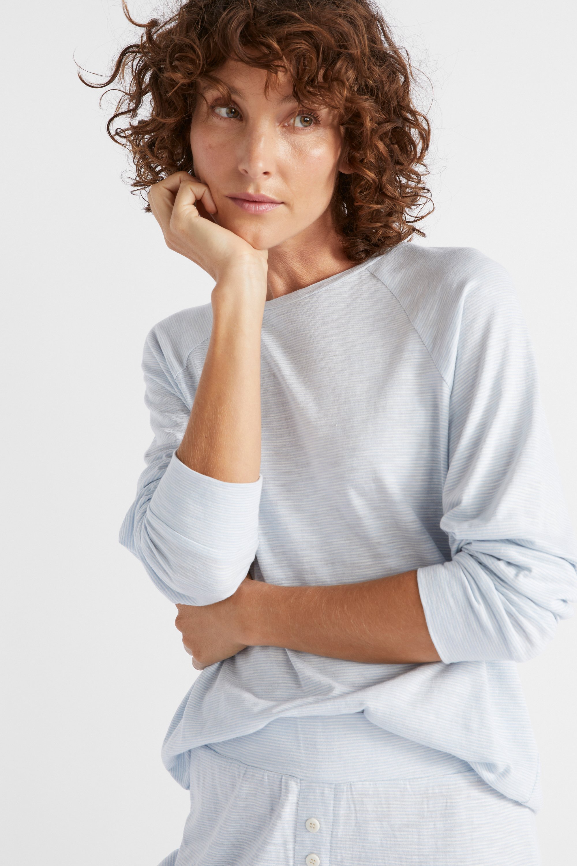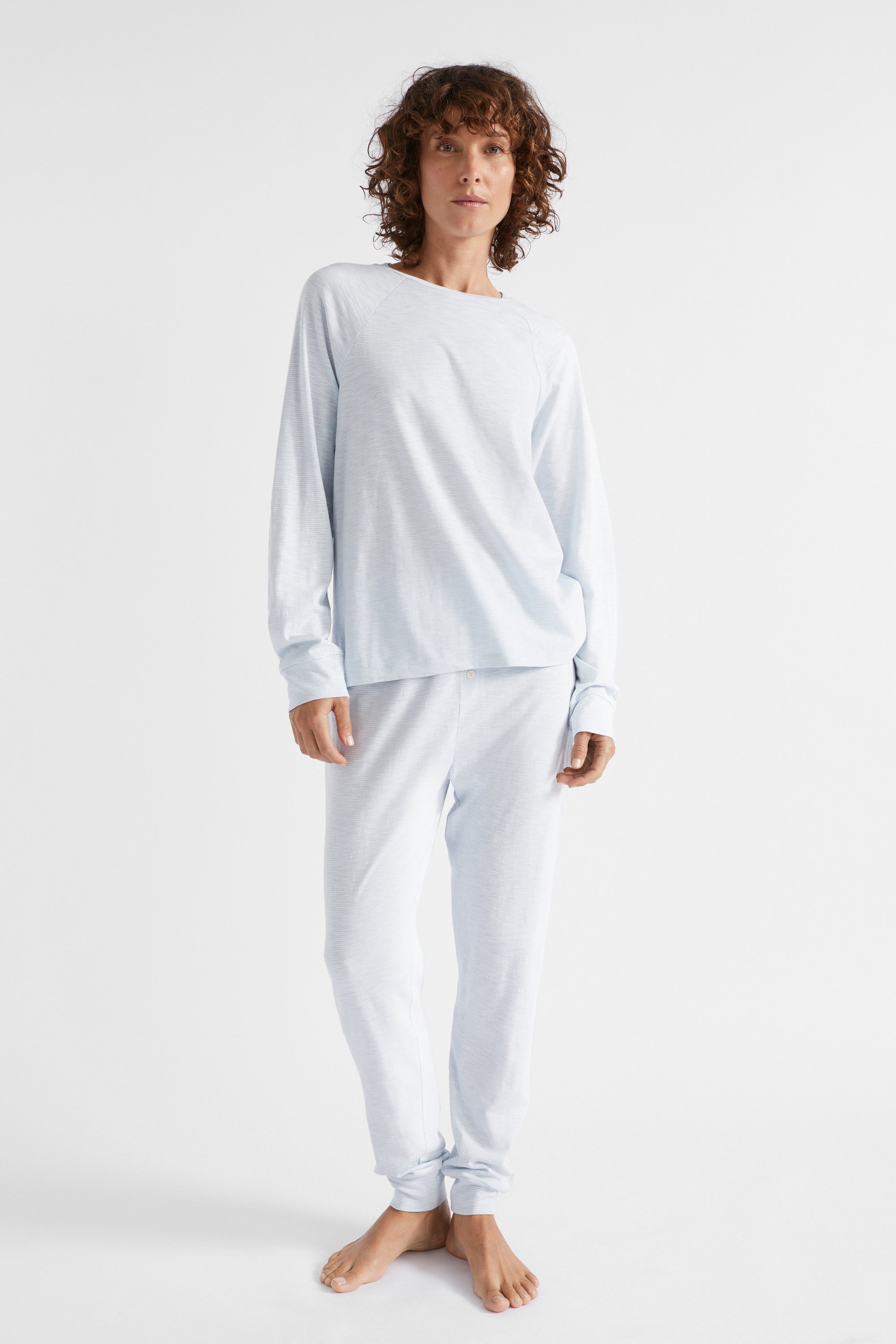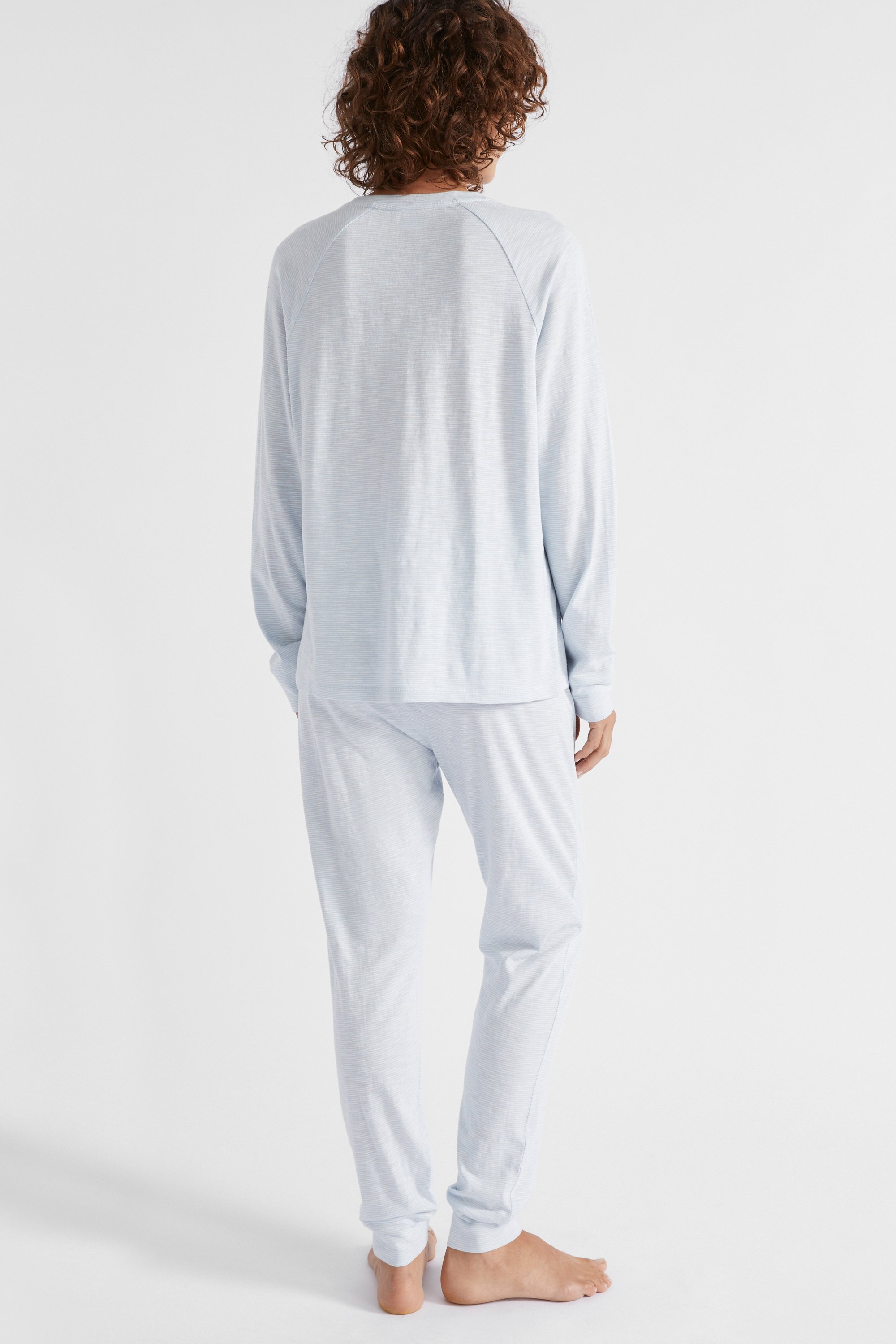 In a classic stripe pattern and a comfortable jersey, this pyjama set is a must-have as the weather cools. The top features a round neck, and long raglan sleeves with cuffs. With an elasticated waistband, the pants have a relaxed leg shape that tapers in at the ankle cuff.