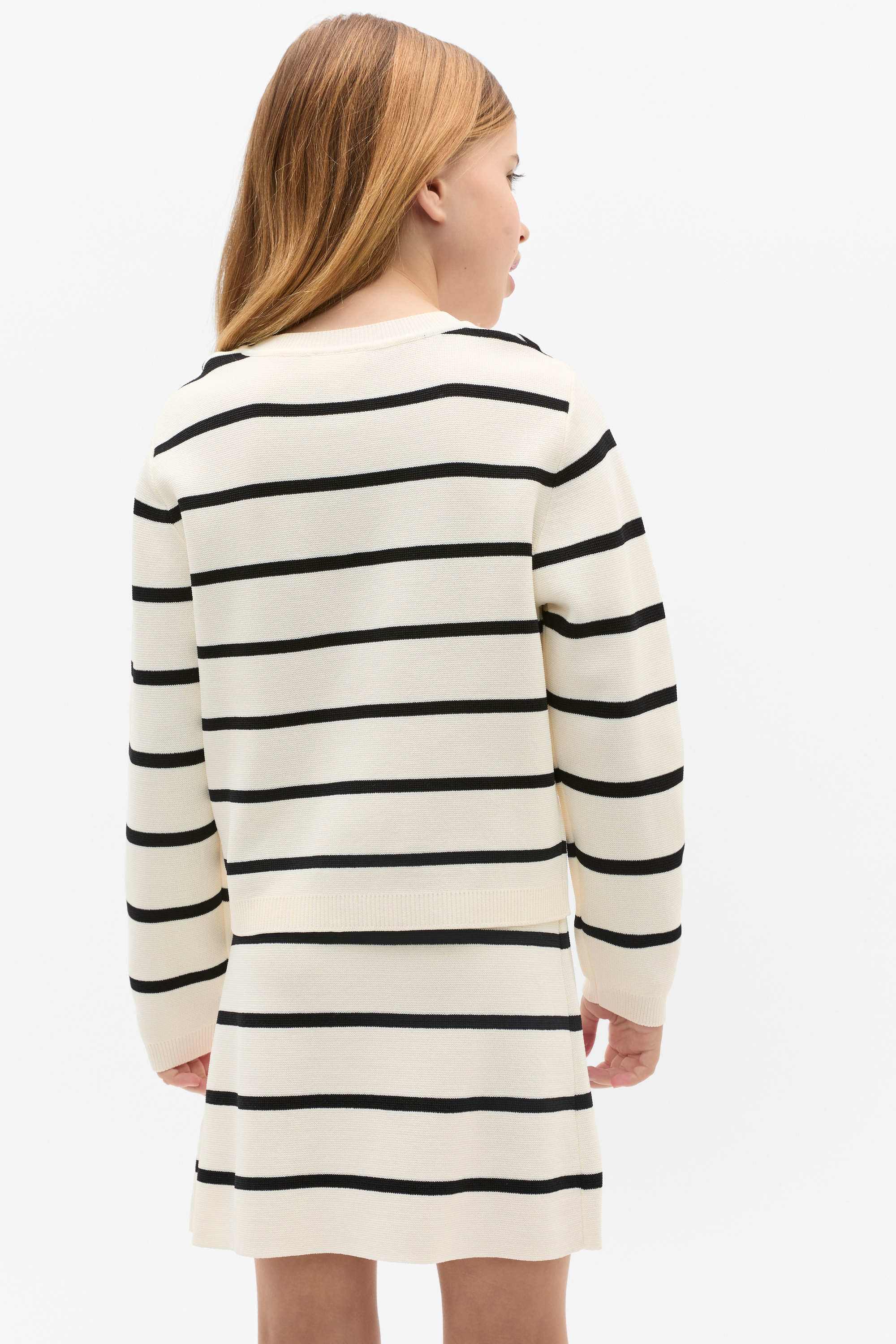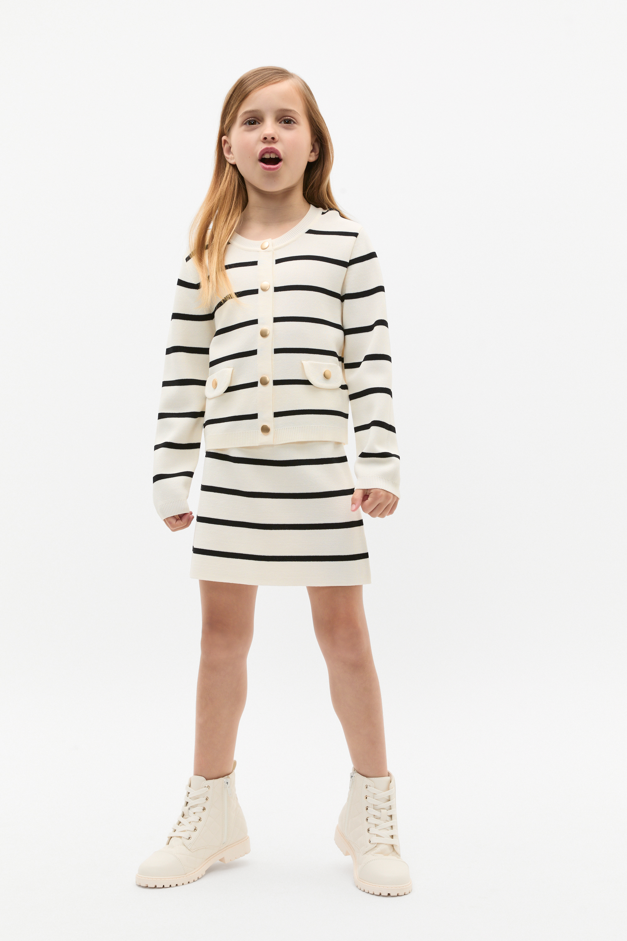Playfully sophisticated, this cardigan has a knit finish and is styled with a timeless stripe. It features a button front with gold-tone hardware and decorative front pockets. Pair with the matching knit skirt for the sweetest head-to-toe ensemble.