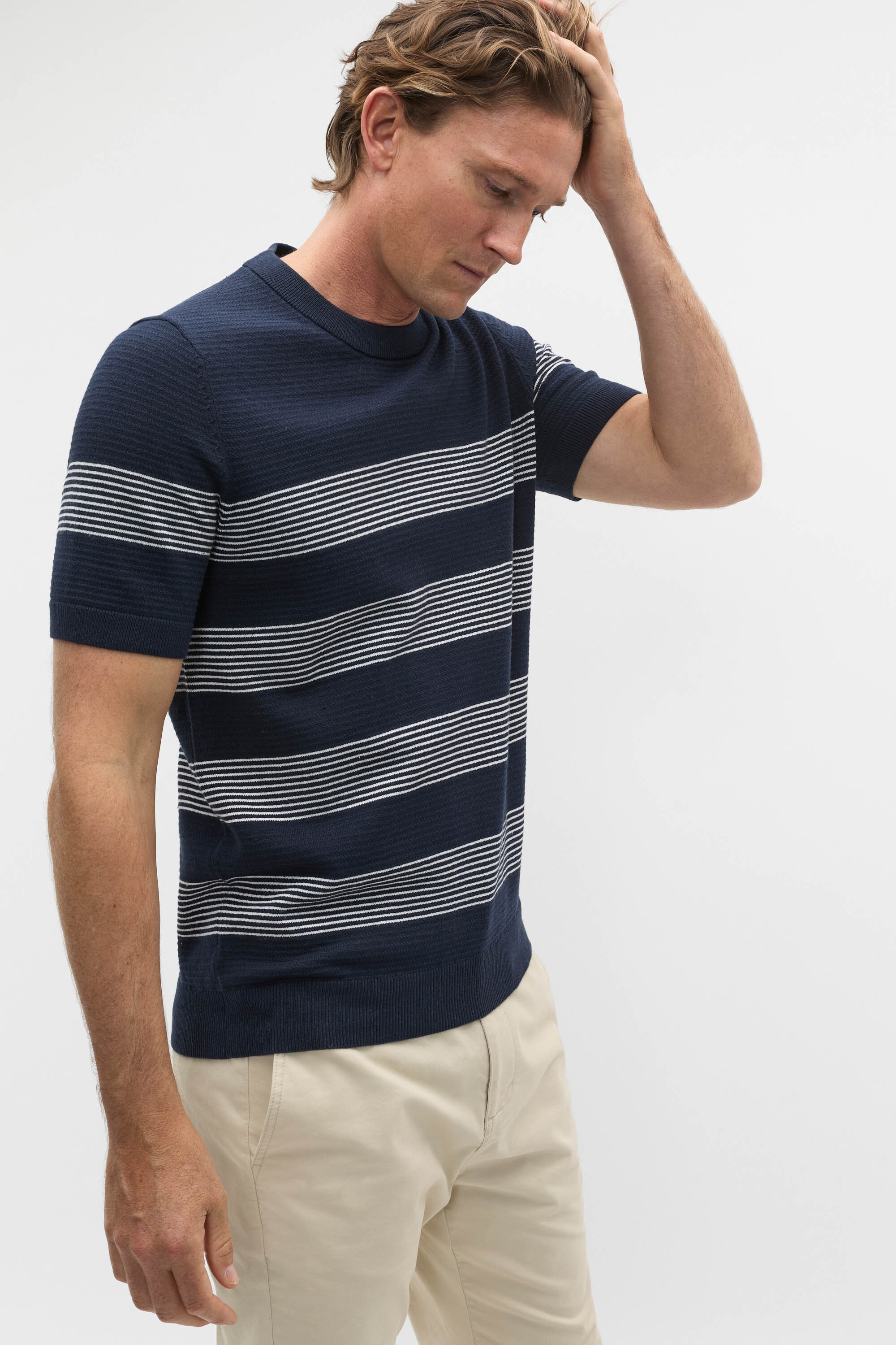 Complete his casual wardrobe refresh with this classic tee. Crafted in a premium cotton blend for all-day comfort, it features a round neck, short sleeves and a relaxed fit. It's finished with a knit texture and has a little stretch. Detailed with a timeless stripe design, it's set to be a new favourite, ready to be worn on repeat.