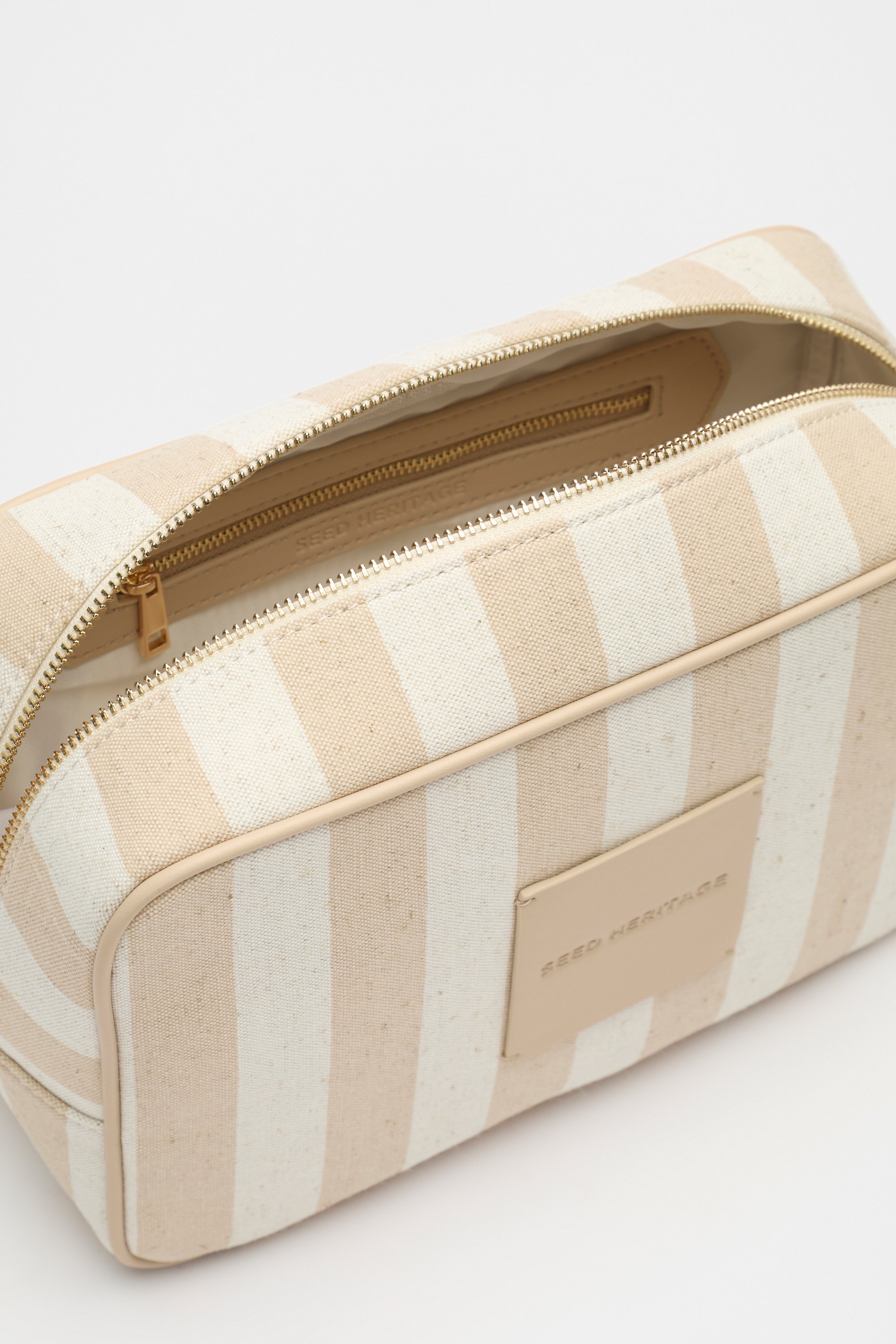 Update your essentials with this chic make up bag. Crafted in a soft fabrication with a stripe design, it features a top zip closure and an inner pocket.