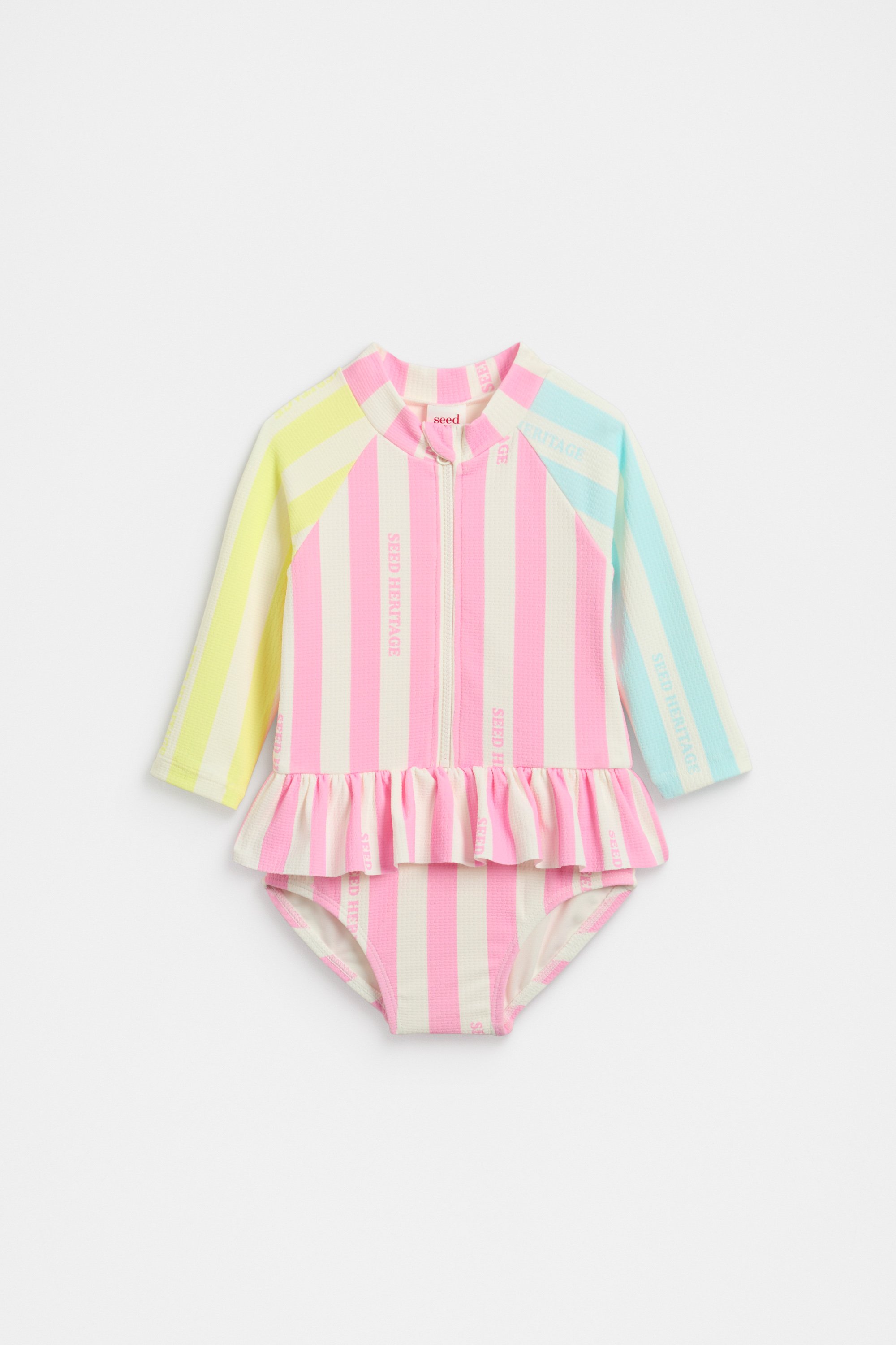 Ready for a summer in the pool, this swimsuit features a brightly coloured stripe design. It features a round neck, long raglan sleeves, a zip front and the cutest ruffle trim detail.