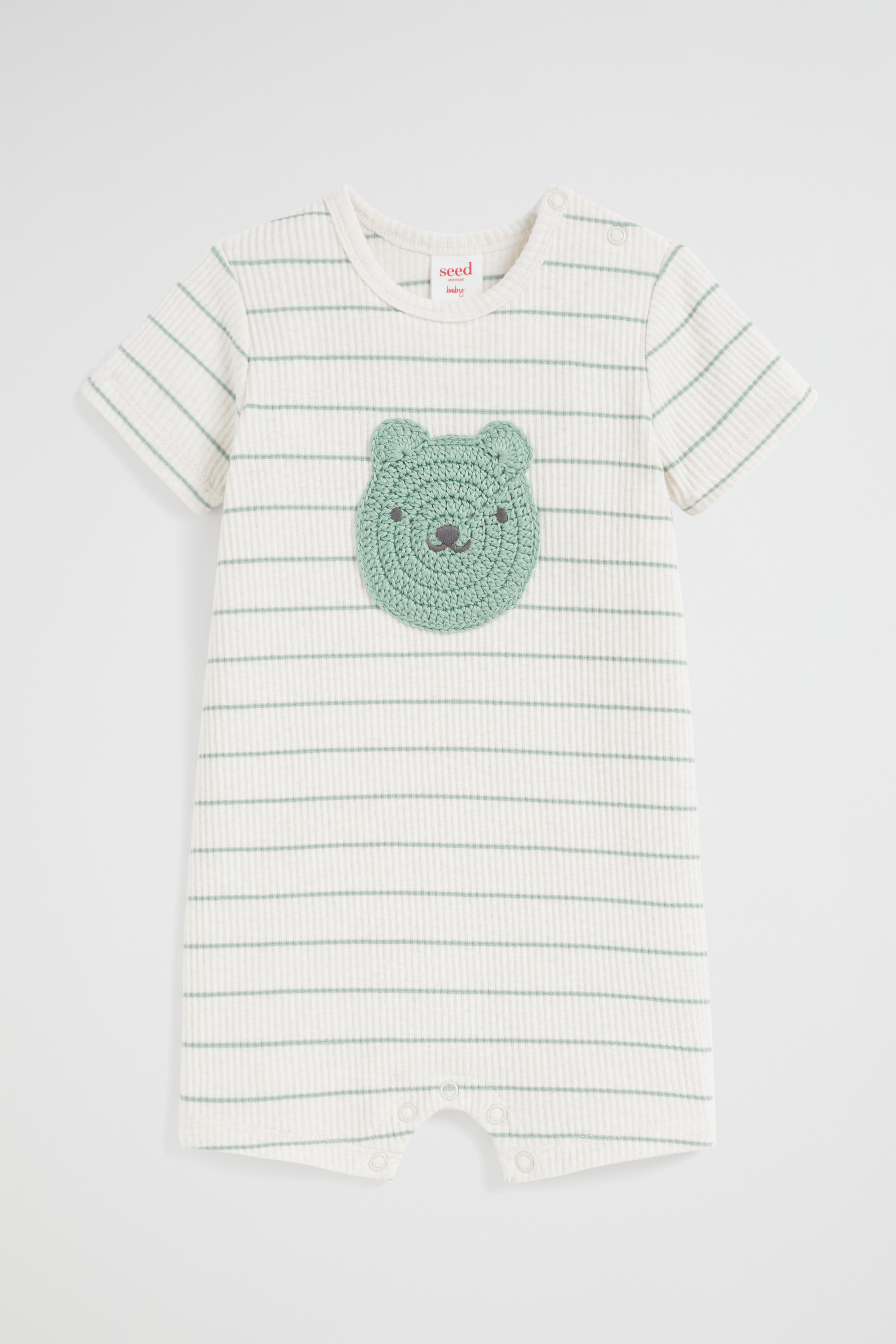 This sweetly striped jumpsuit is crafted from a soft rib knit, making it comfortable for your newborn to wear. The classic short sleeve jumpsuit design features ribbed cuffs and neckline as well as snap button fastenings on the shoulder for convenient changing. The jumpsuit is decorated with a sweet bear motif on the front.