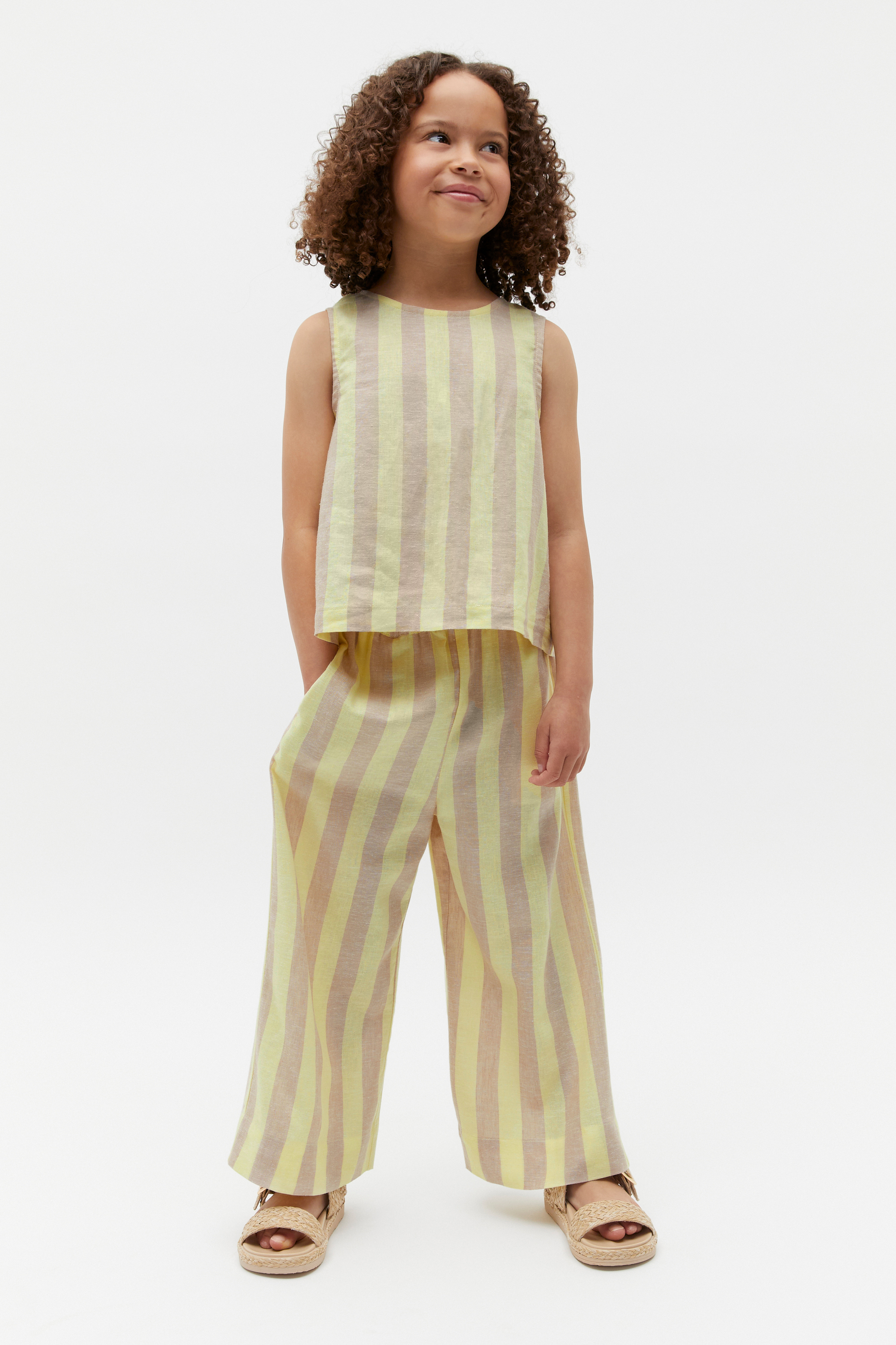 With the sweetest stripe pattern, this shell top is a cute addition to her wardrobe. It features a round neck, sleeveless construction, and an elasticated rear section. Fully lined, it's crafted from a fabric blend containing linen. It can be paired with the matching striped shorts for a coordinated look.