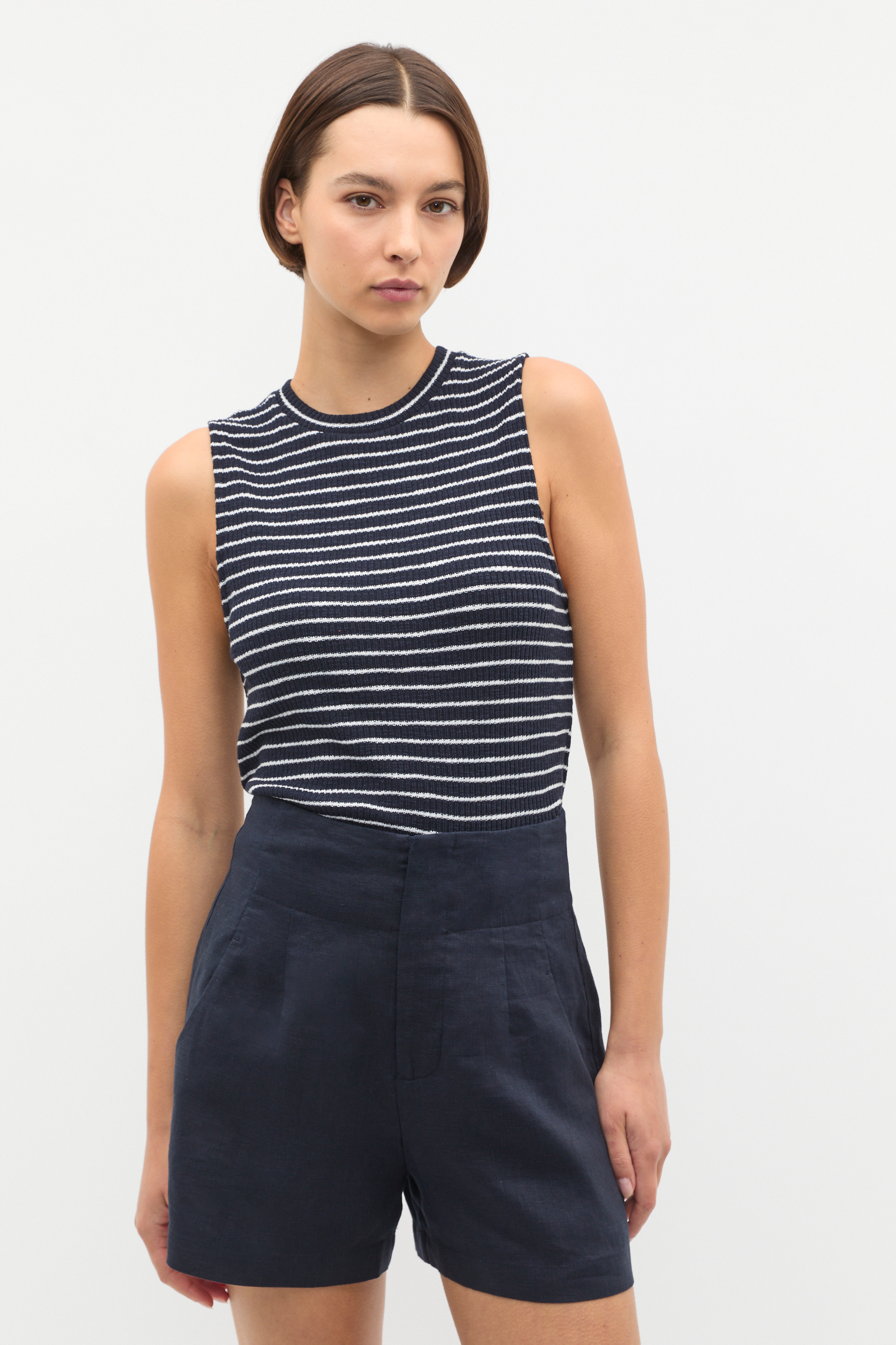 Update your summer wardrobe with this classic and comfortable shell top. Crafted in a soft, lightweight blend, it features a round neck, textured finish and a timeless stripe design. It's a versatile style, perfect to pair with your favourite pieces.
