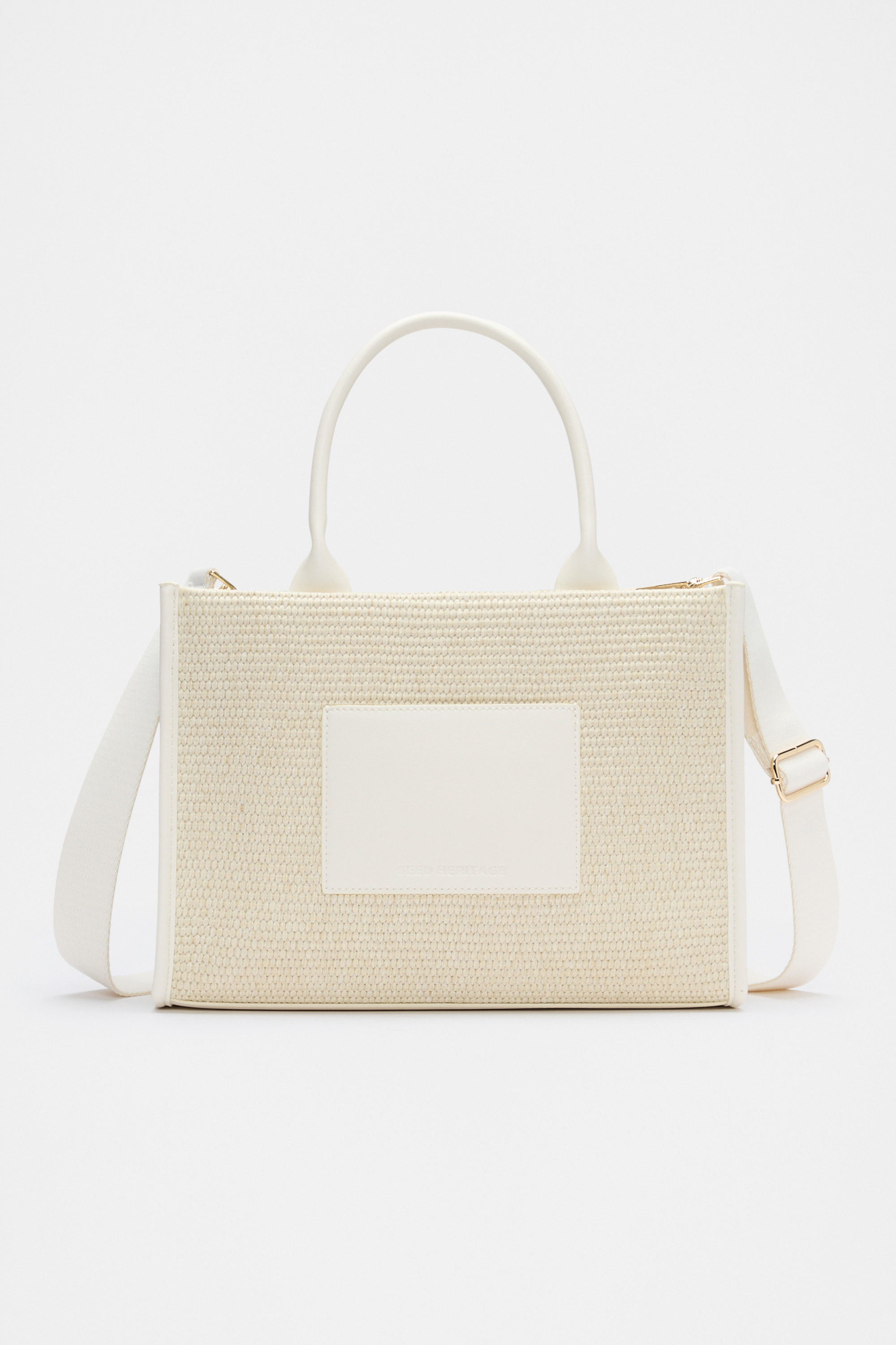 This tote bag is a chic miniature style with a textured raffia outer and a structured shape. It features a front pocket, short carry handles, a detachable crossbody strap with branded webbing and is fully lined with an internal zip pocket.