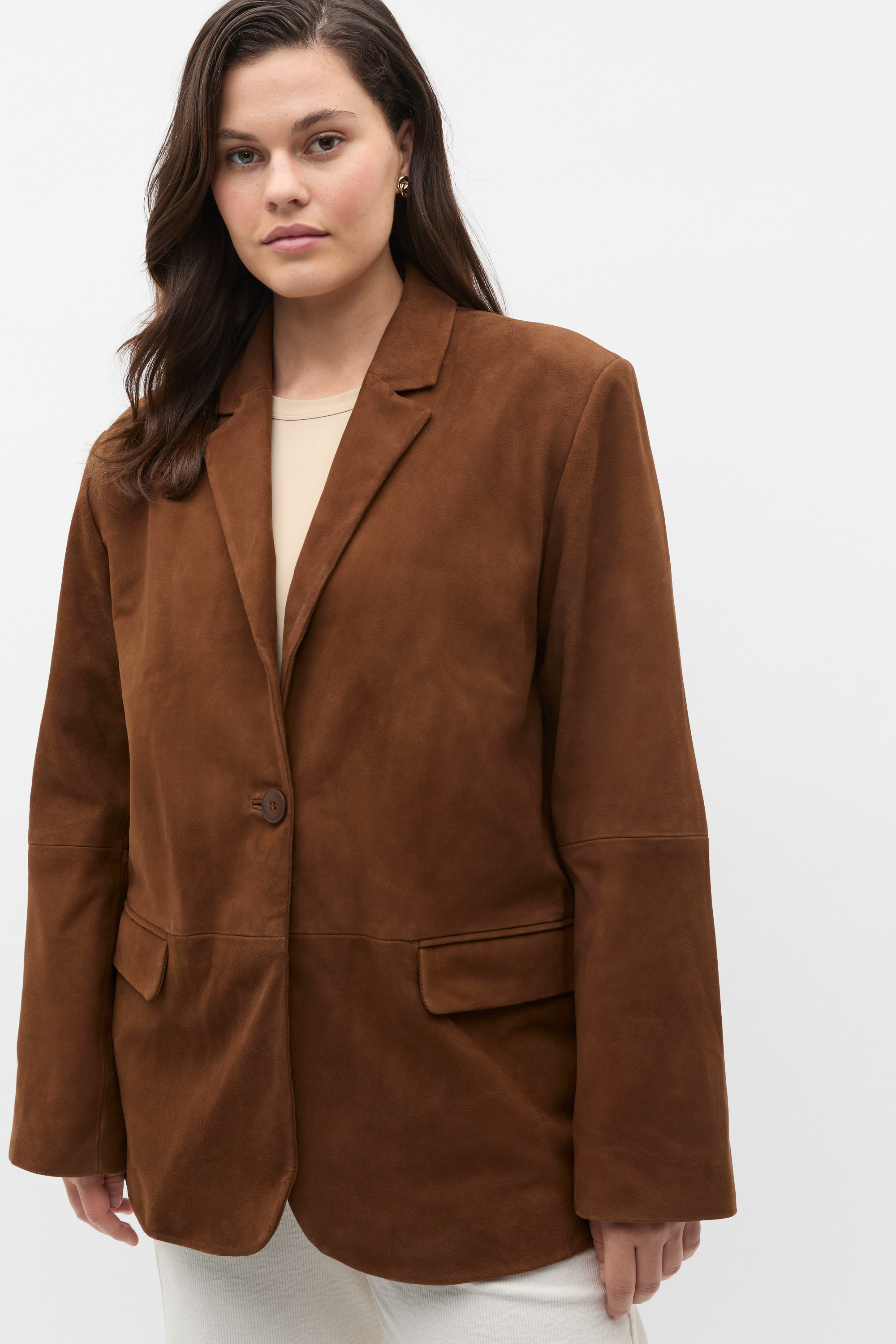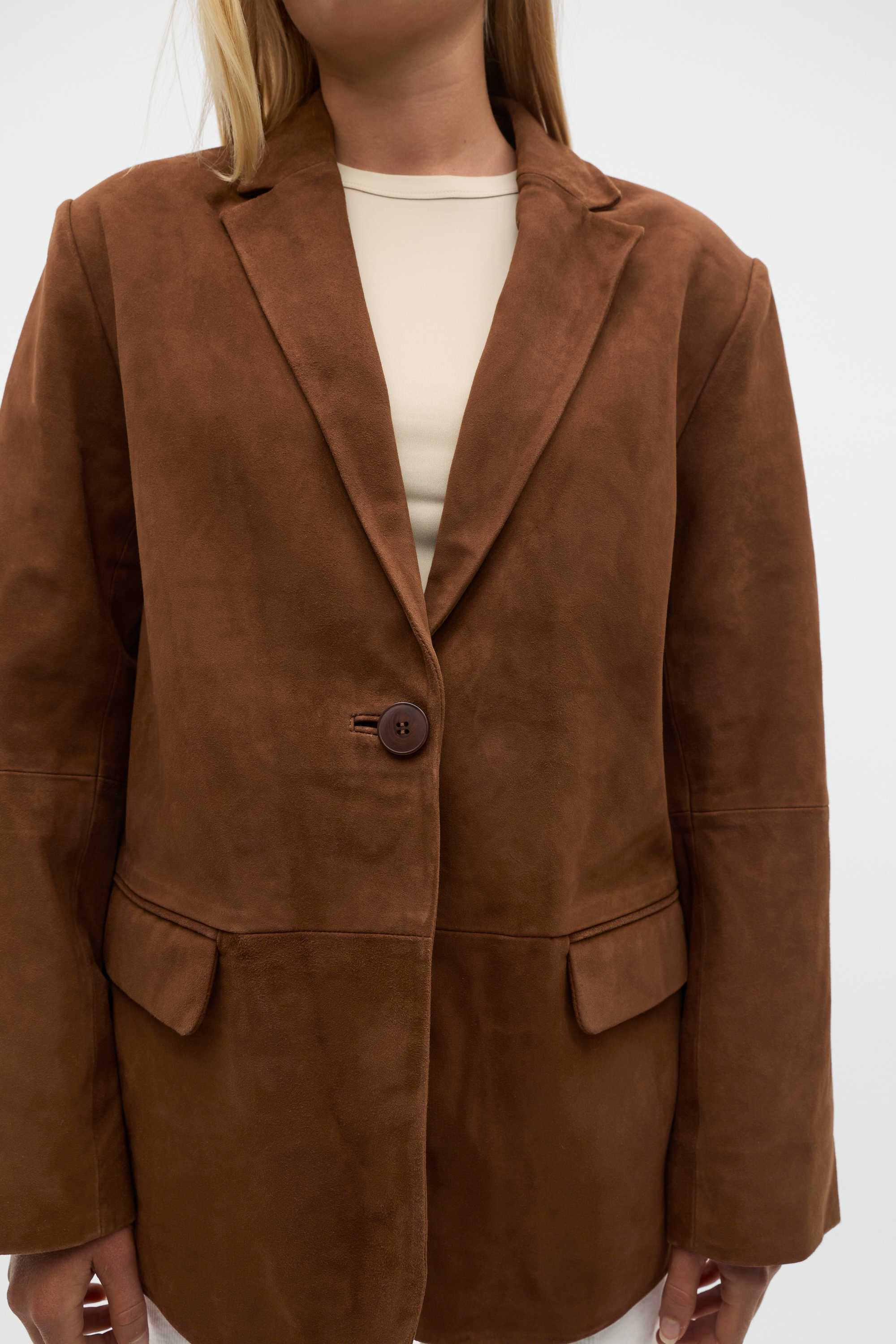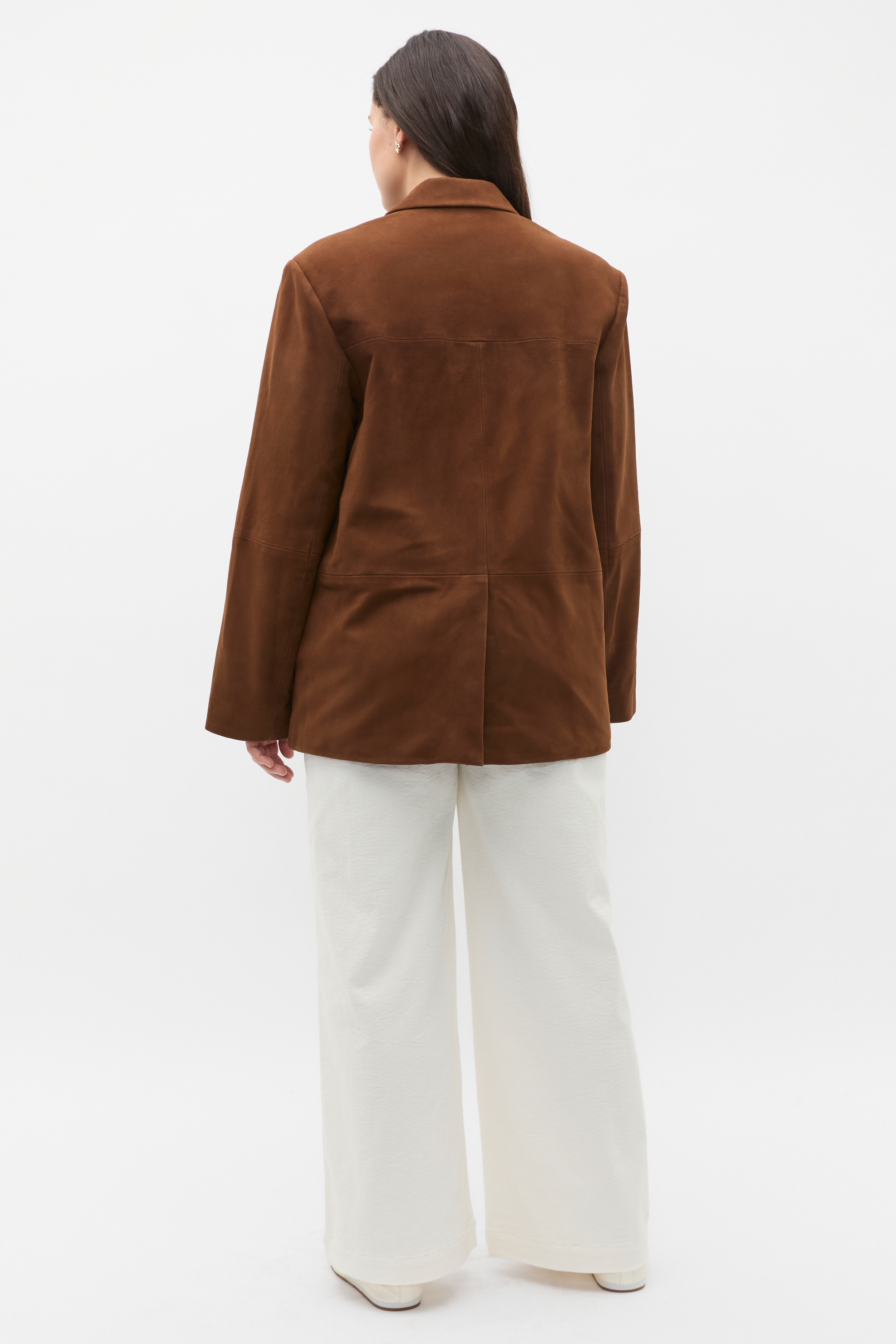 Perfected in form and function, this suede blazer offers sophistication and elegance. Crafted in premium leather, it features a notched lapel, long sleeves, a tailored longline cut with a rear vent and pockets. Style with the coordinating suede skirt for a modern suiting moment with instant impact. As a proud member of Leather Working Group, Seed supports their mission of greater transparency and continuous improvement, helping to create more responsible leather production. For more information, please visit Leather Working Group.