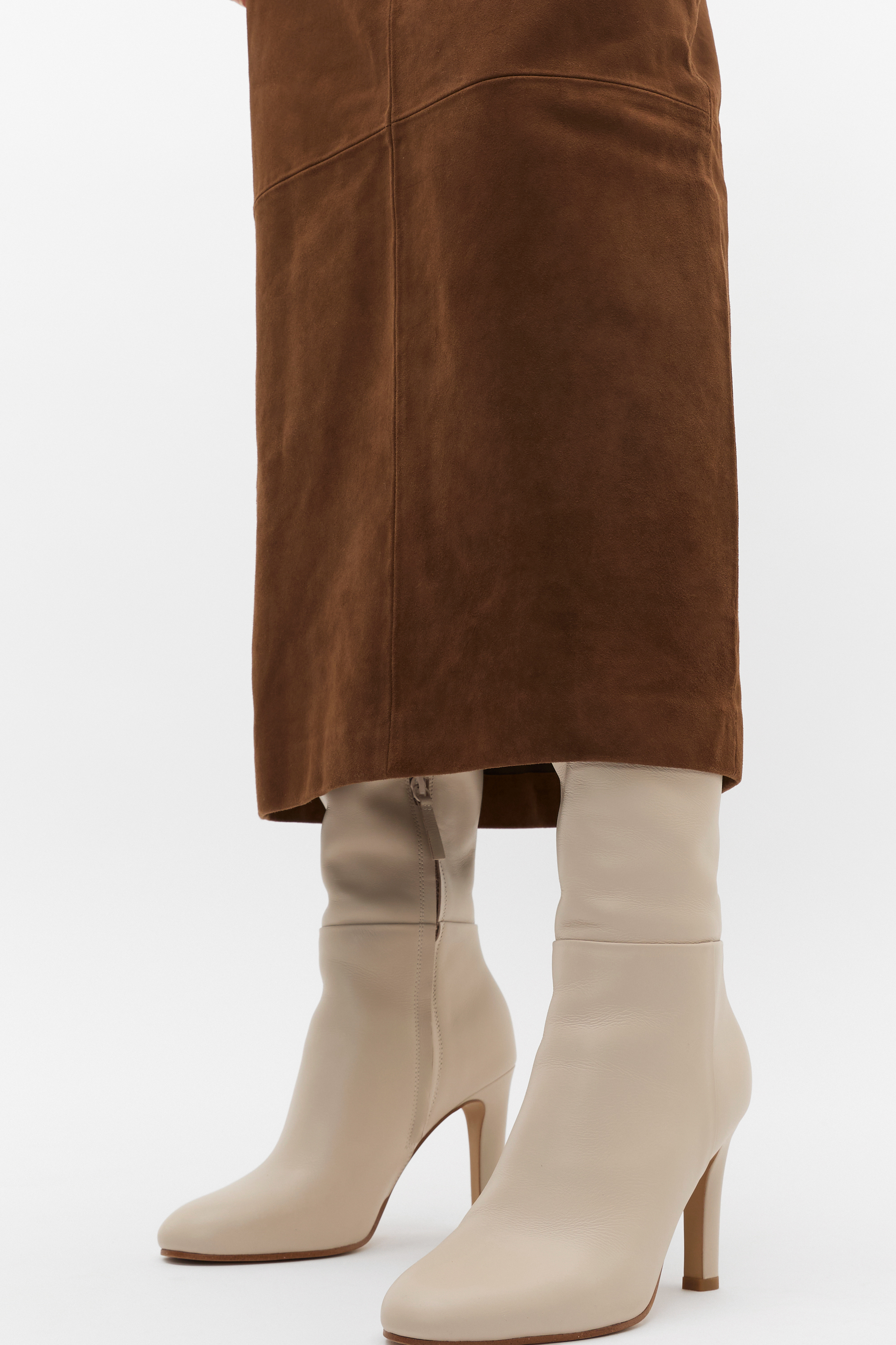 Your head-to-toe styling gets a sophisticated new look with this timeless suede skirt. Crafted in premium leather, it features a fixed waistband, secures with a zip at the rear and falls to a midi length for a statement look. It's also fully lined and has a rear vent for ease and wearability. Style with the coordinating blazer for a modern suiting moment with instant impact. As a proud member of Leather Working Group, Seed supports their mission of greater transparency and continuous improvement, helping to create more responsible leather production. For more information, please visit Leather Working Group.