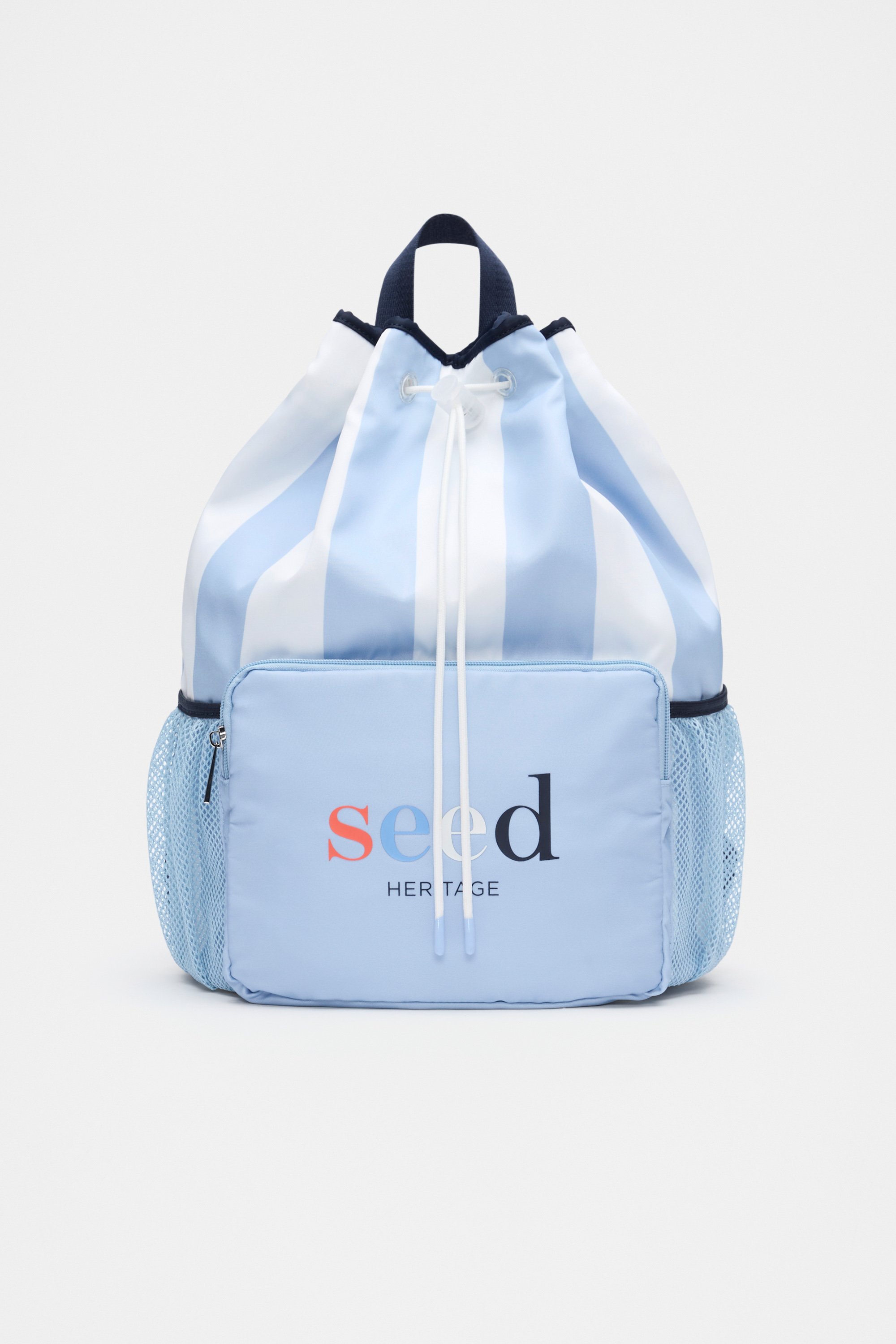 Ready for all their swimming adventures, this water-resistant bag is packed with handy compartments as well as backpack straps and a hanging loop. It has a drawstring, elastic side pockets, a front zip pocket with a Seed Heritage logo and a bold colourblock stripe design. Pair with the matching swim styles and matching swim wet bag to get them ready for the pool.