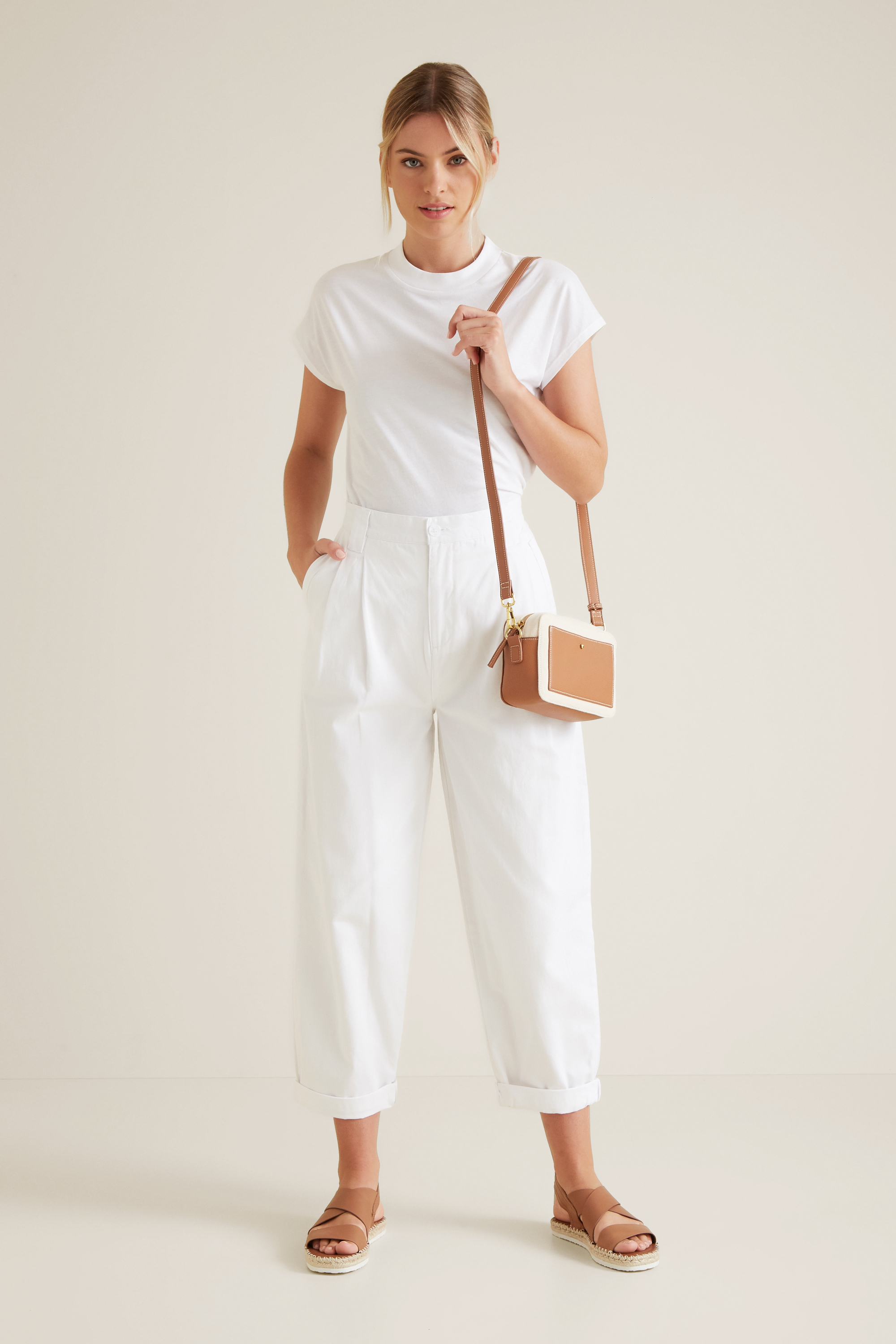 Pare back officewear and glamourous wardrobe staples, with these Tapered Casual Pants. Anchored high on the waist, these pants are crafted from a rigid twill, detailed with a zip and button closure, belt loops, functional pockets, and cuffed hems. For your reference, our model is 177 cm tall and wears a size 8. Check the label inside of the garment for care instructions.