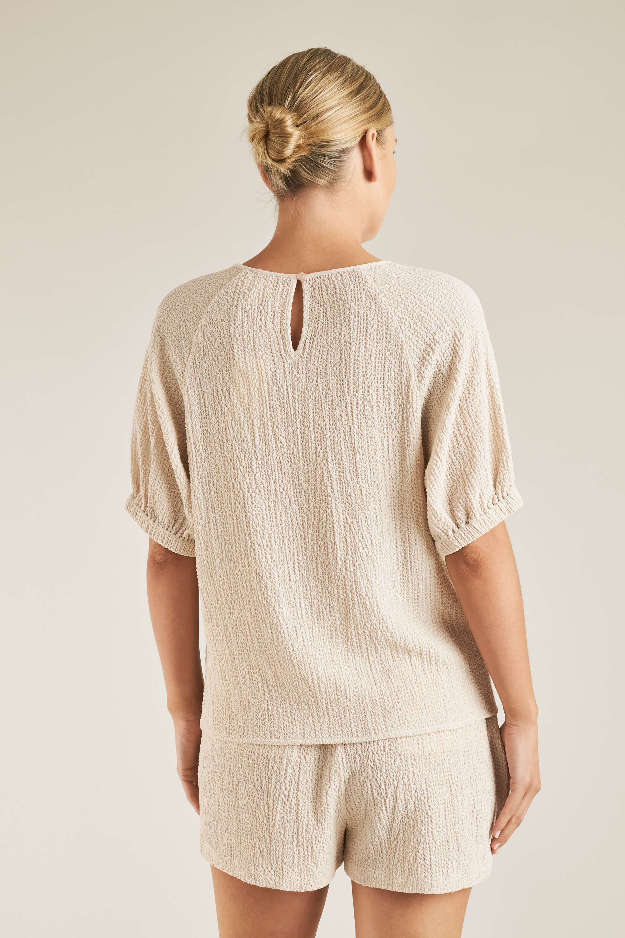 Update your wardrobe staples, with this Textured Blouse. Featuring a crew neckline, blouson sleeves, button back closure and flowy silhouette.