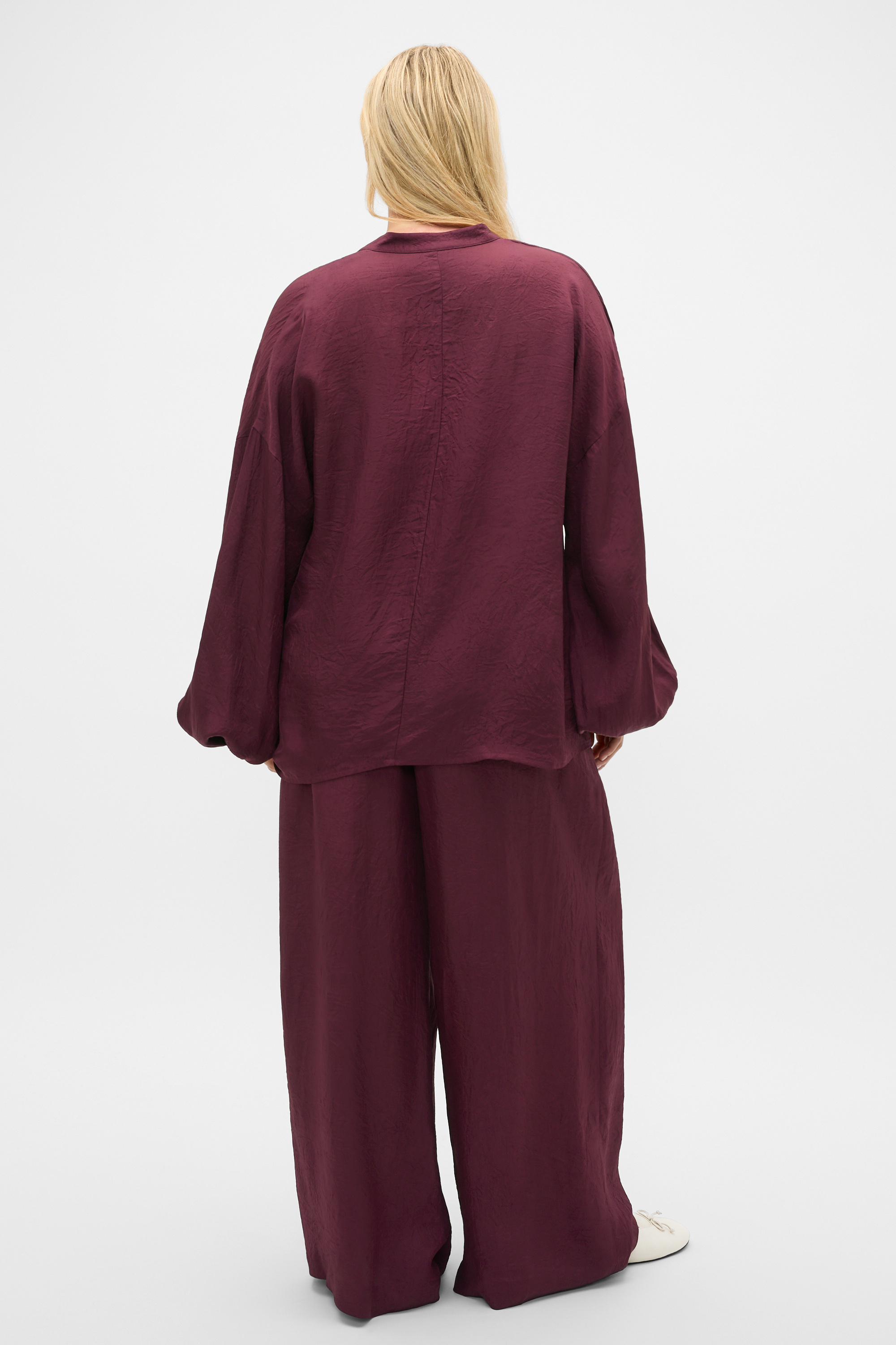Elevated with a textured satin finish, this blouse is designed to elevate your everyday style. It features a V neck with a round collar detail, a drop shoulder with a statement sleeve, securing with button cuffs at the wrist and a relaxed, flowing fit through the body. Bringing volume to your look, this blouse pairs effortlessly with your favourite pieces and can be dressed up or down.