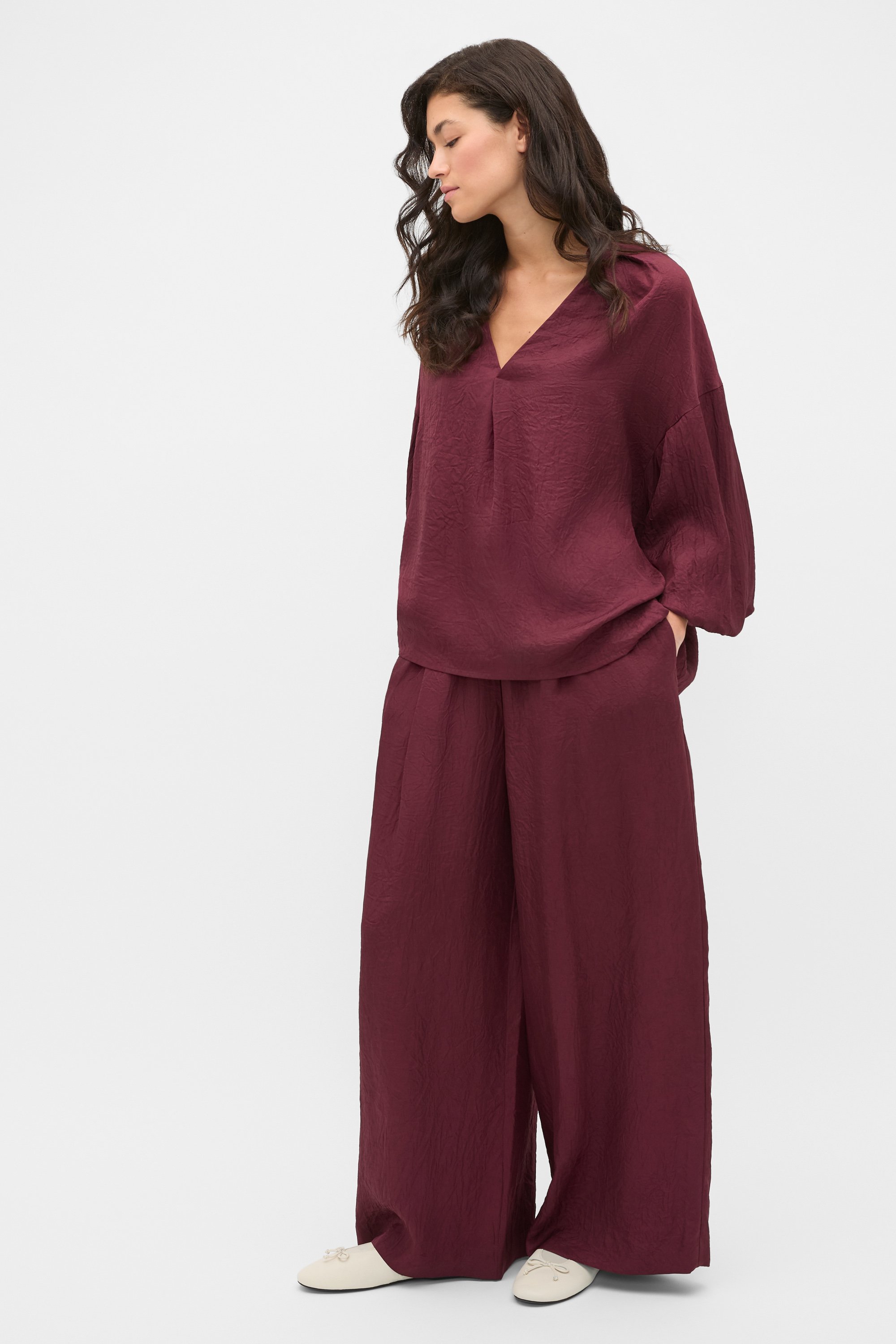 Elevated with a textured satin finish, this blouse is designed to elevate your everyday style. It features a V neck with a round collar detail, a drop shoulder with a statement sleeve, securing with button cuffs at the wrist and a relaxed, flowing fit through the body. Bringing volume to your look, this blouse pairs effortlessly with your favourite pieces and can be dressed up or down.