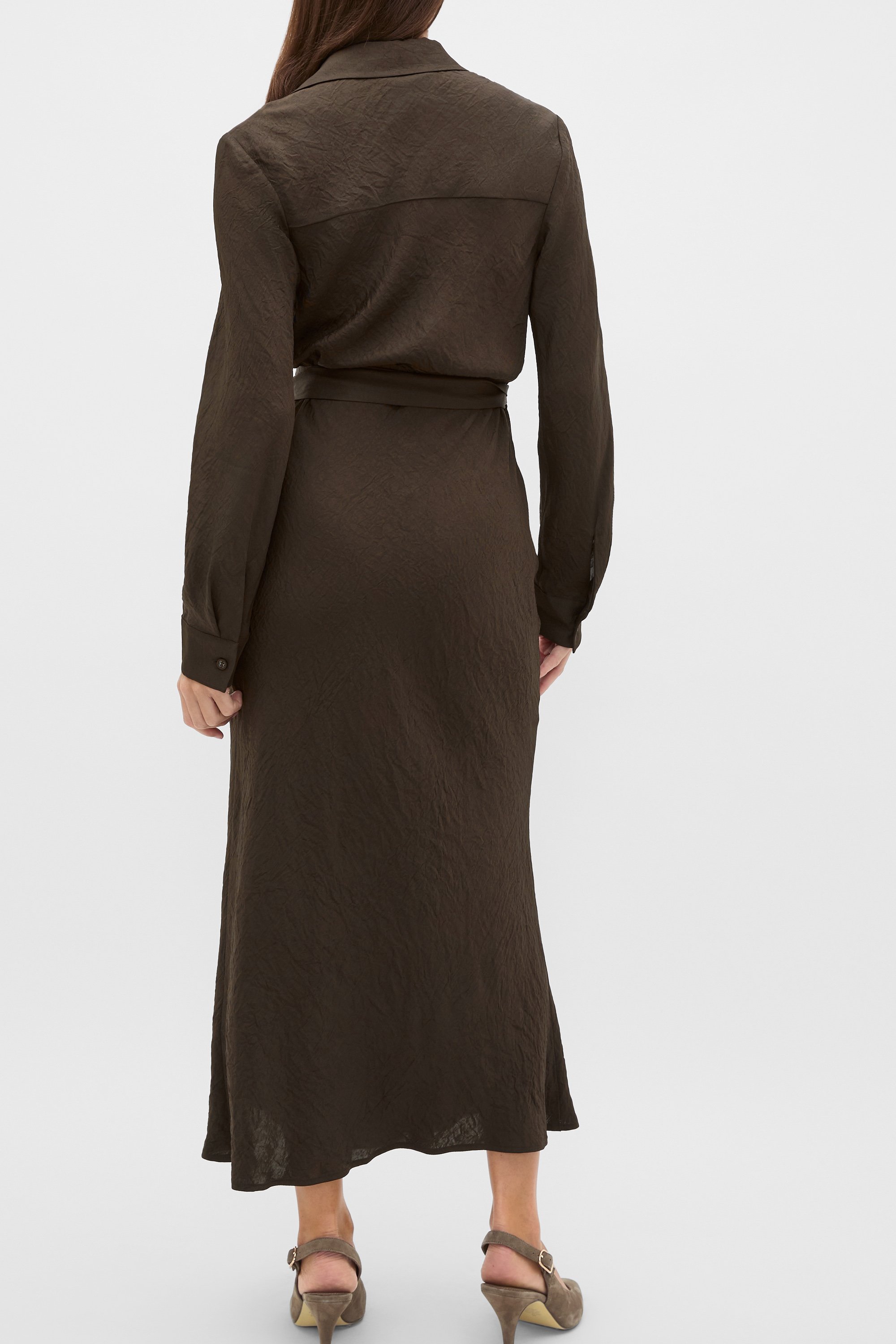 Statement dressing is made easy with this sleek and feminine satin dress. With a flattering wrap front design, it features a collar, long sleeves, and a belt that secures around the waist. It falls to a midi length to add a feeling of sophistication to your look.