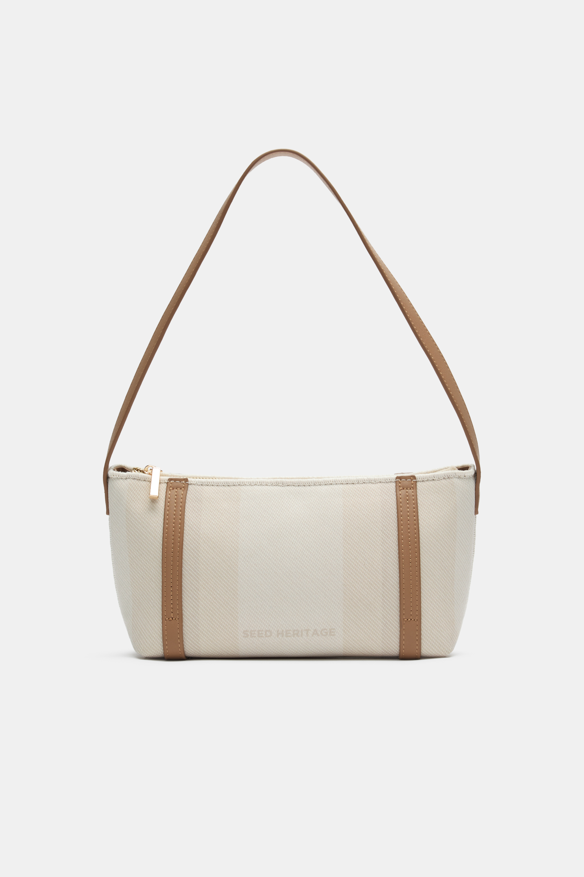 Designed for everyday wear, this shoulder bag is effortless and lightweight. Finished with a two tone design, it features a contrast of textured fabric and PU trims. It has a zip opening at the topline, and internal zip pocket and is fully lined with soft gold trims.