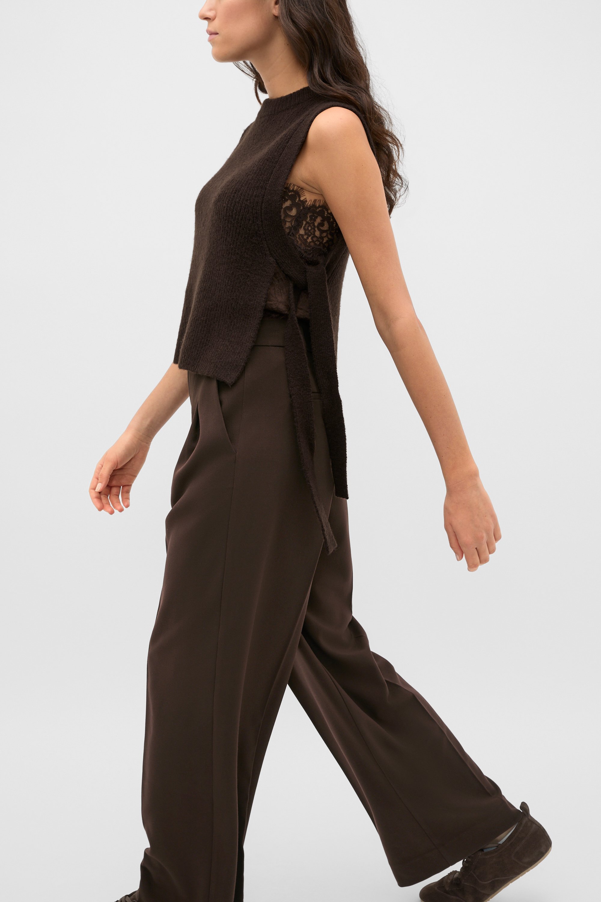 Securing with a tie under the arm, this bib has a high collar and is the perfect lighter weight layer to add into your winter wardrobe.