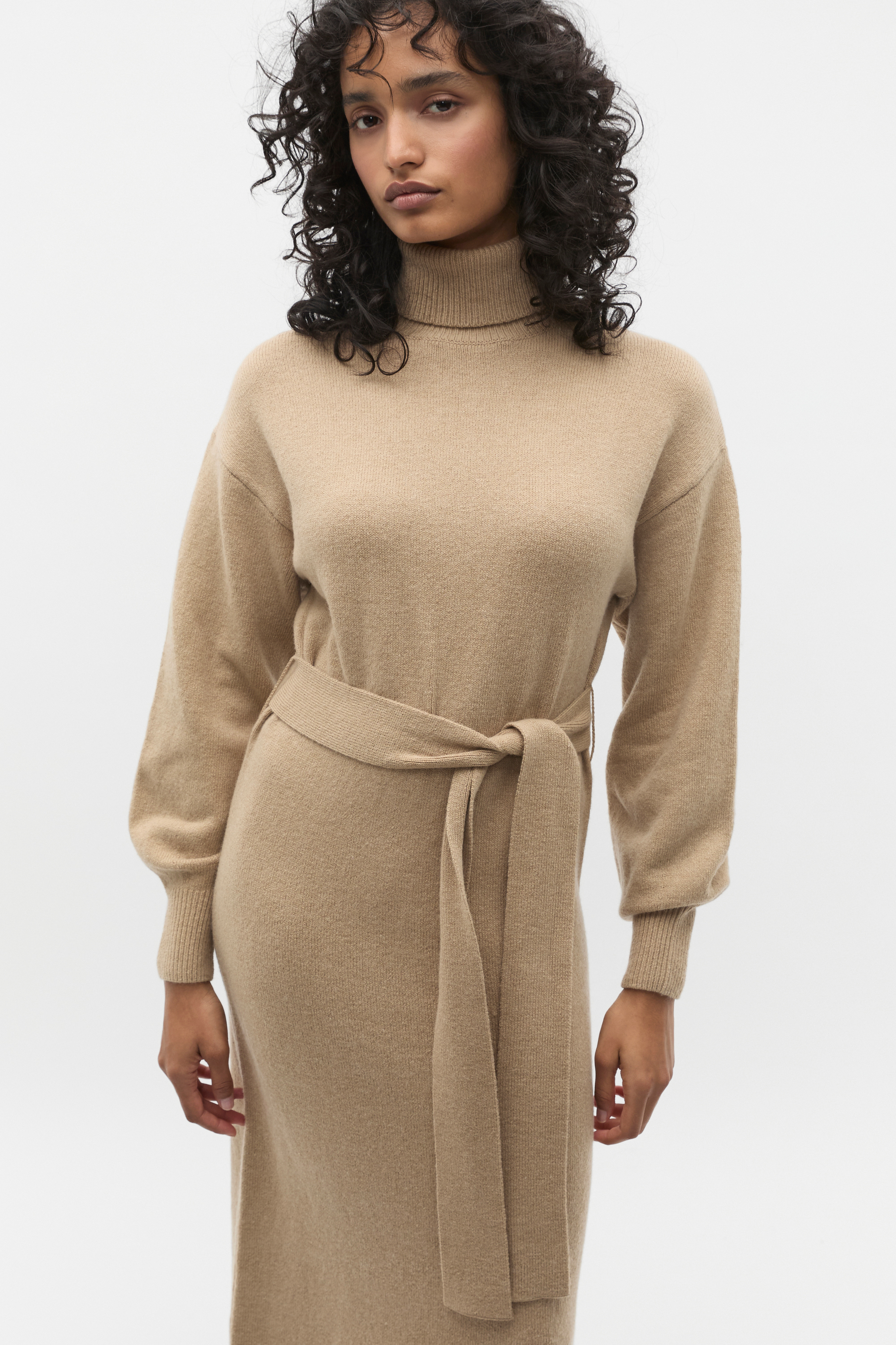 Winter styling is made easy with this chic knit dress, designed to offer warmth with a touch of luxe. It features a high neck, long sleeves with a wide balloon effect and ribbed trims at the cuffs. It falls to a midi length and has a tie belt to cinch the waist and flatter your shape. Containing wool and cotton, it's a medium weight knit, perfect for staying cosy.