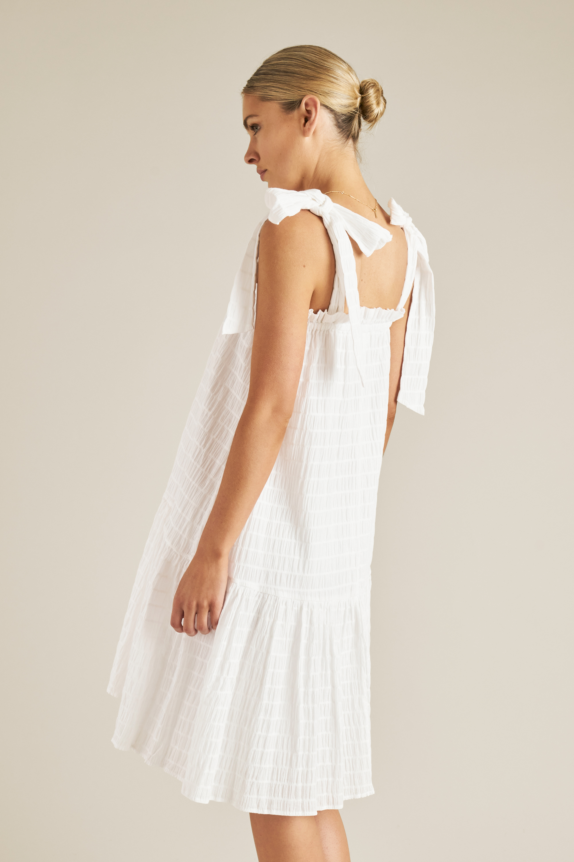 Introducing a luxurious women's collection that has been artfully crafted to capsure a Riviera Retro aesthetic. This Tie Up Resort Dress features a square neckline, tie shoulder straps and drop peplum hemline.