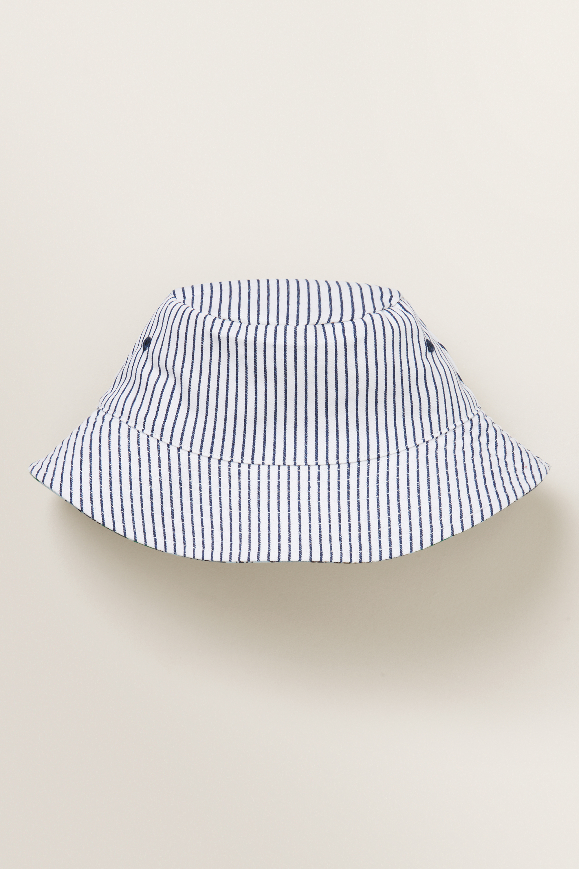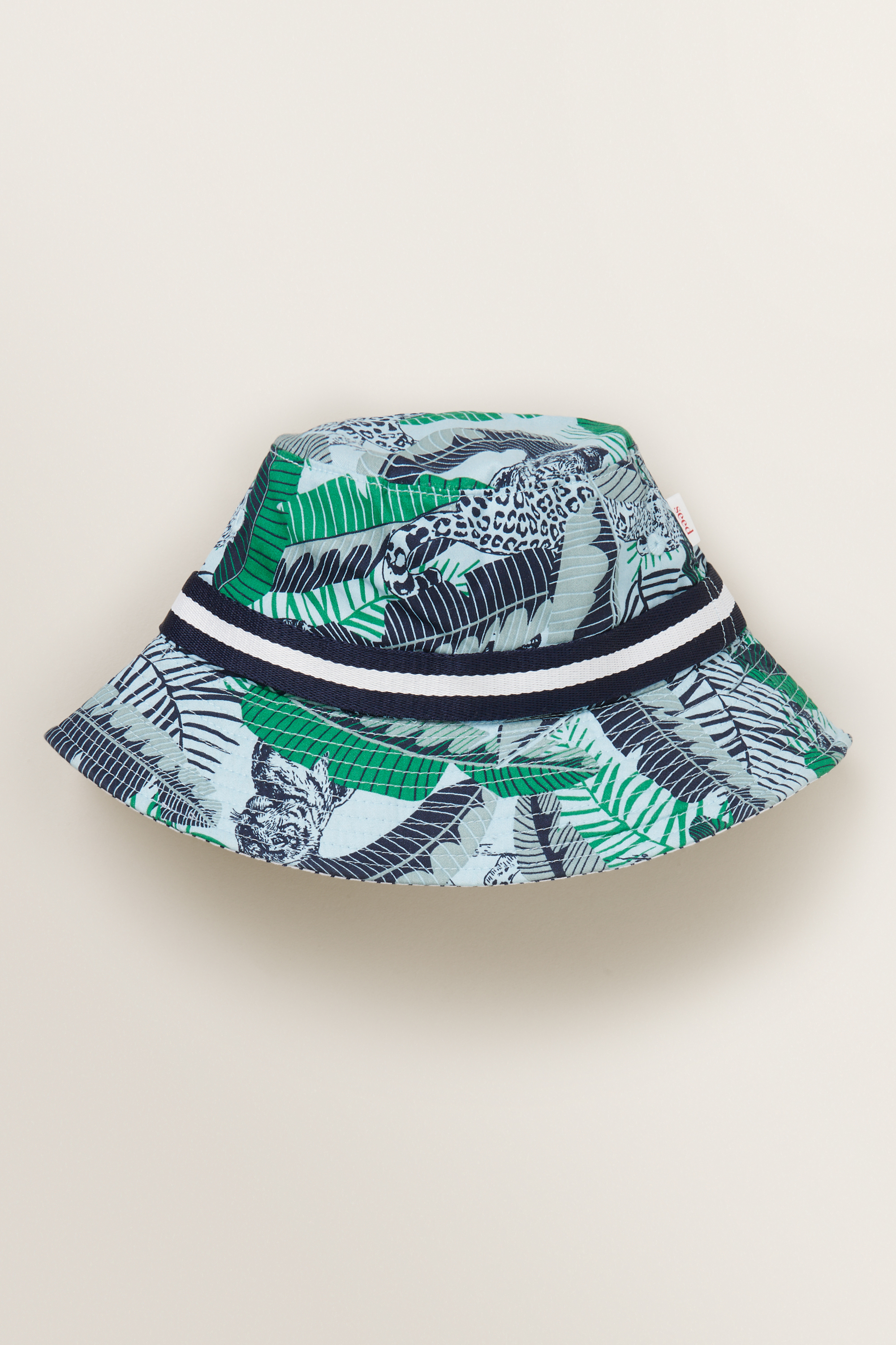 Designed from a lightweight fabrication, this Tropical Bucket Hat features a leaf and stripe reversible print, flat crown and short brim.