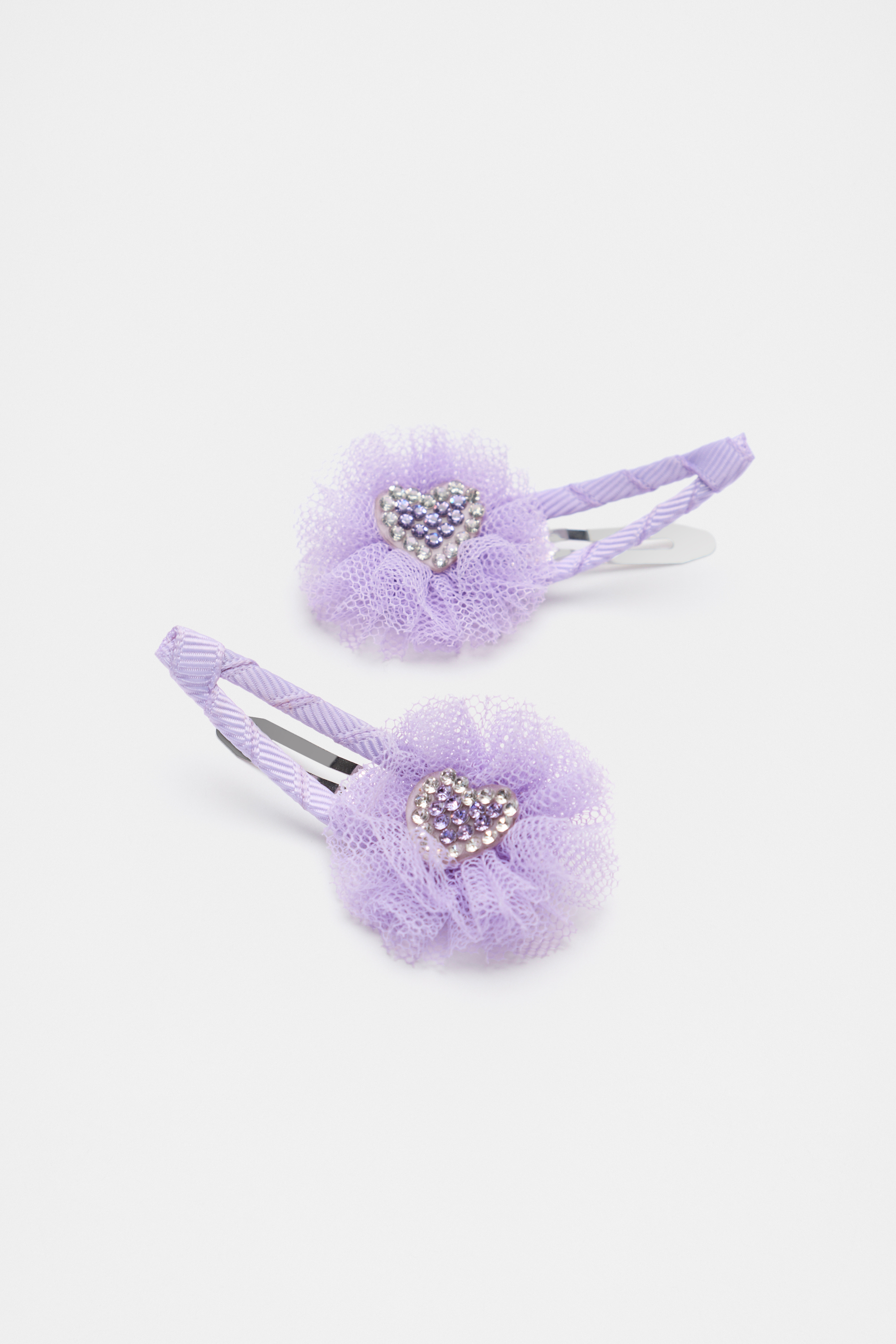 These snaps feature a tulle flower design on a grosgrain ribbon-wrapped hair snap, with glitter heart centres. This product is not a toy and is not suitable for children three years and under.