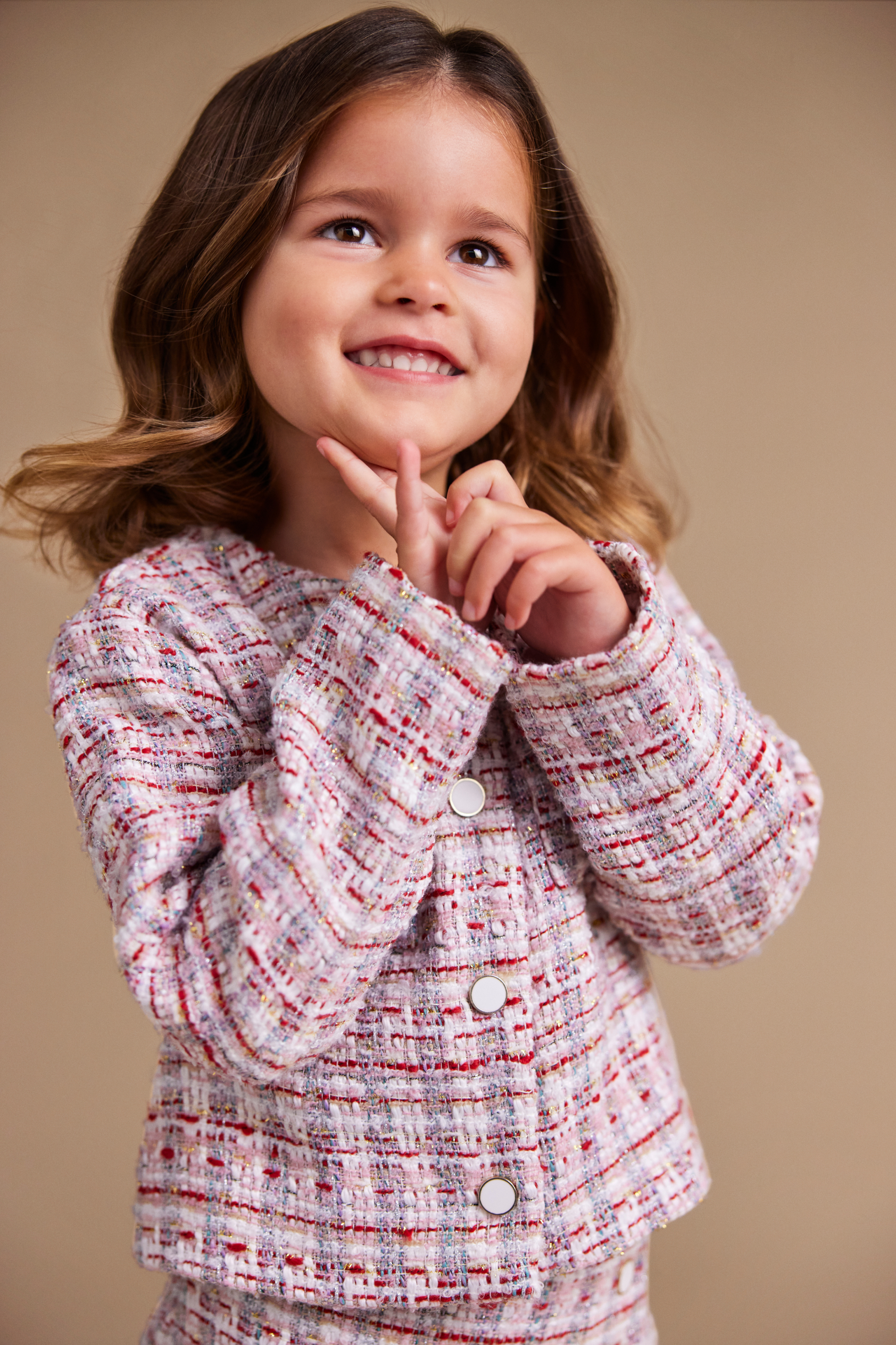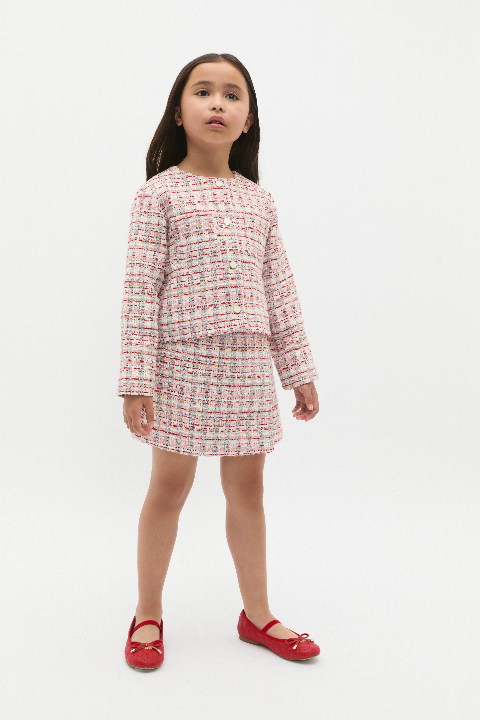 Finish her outfit with this sweet tweed jacket, textured to add interest to her head-to-toe. Perfect for special occasions and family events, it features long sleeves, a button-through front and two front pockets. Style with the matching tweed skirt, dress or accessories to have her twirling in her party-ready best.