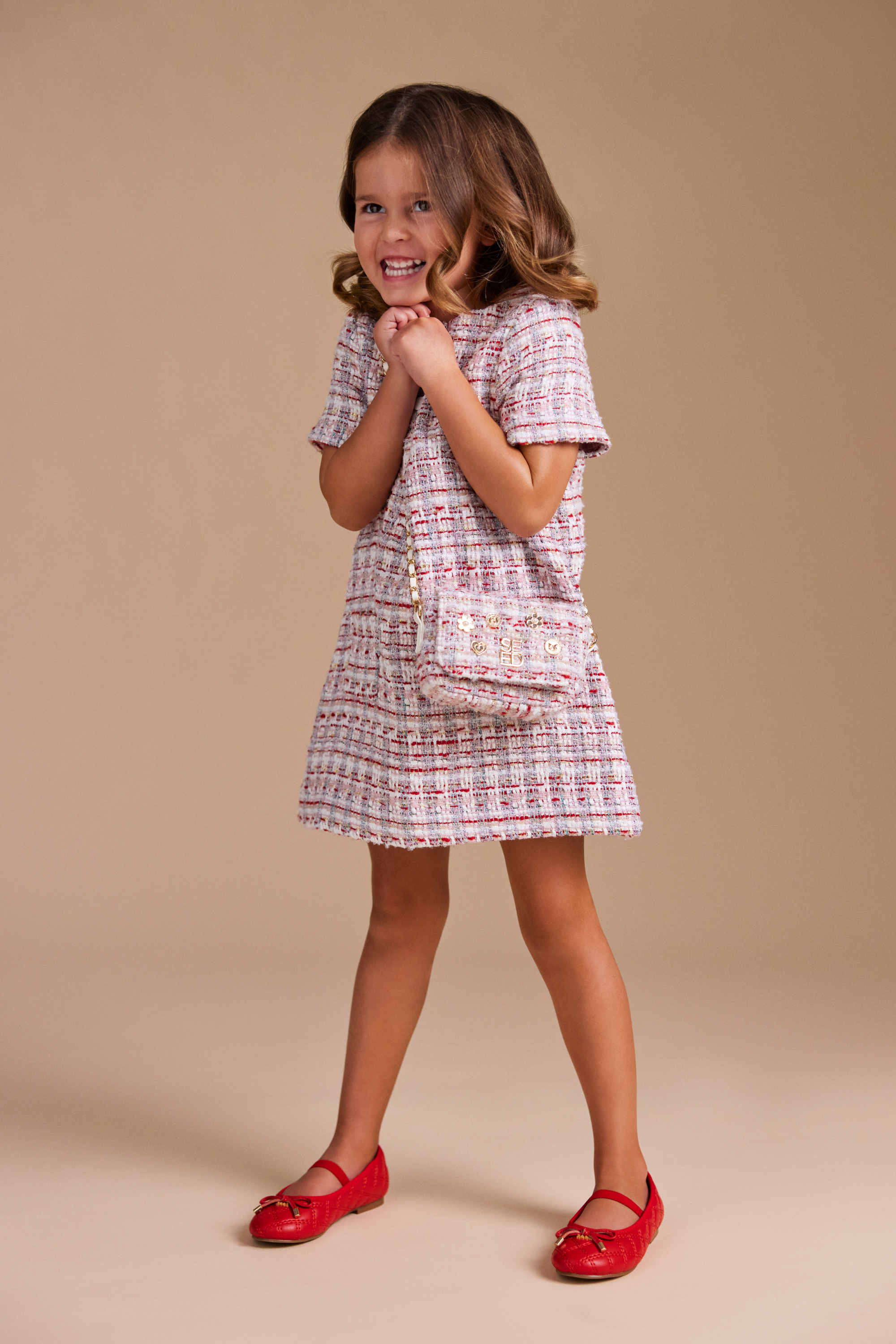 She'll be party-ready and more chic than ever in this tweed dress, designed for her special occasions and family events. It features a round neck with a button detail, short sleeves and two front pockets. It secures with an invisible zip at the back of the neck. Pair with the coordinating accessories or jacket for the sweetest matching set or for the perfect gift.