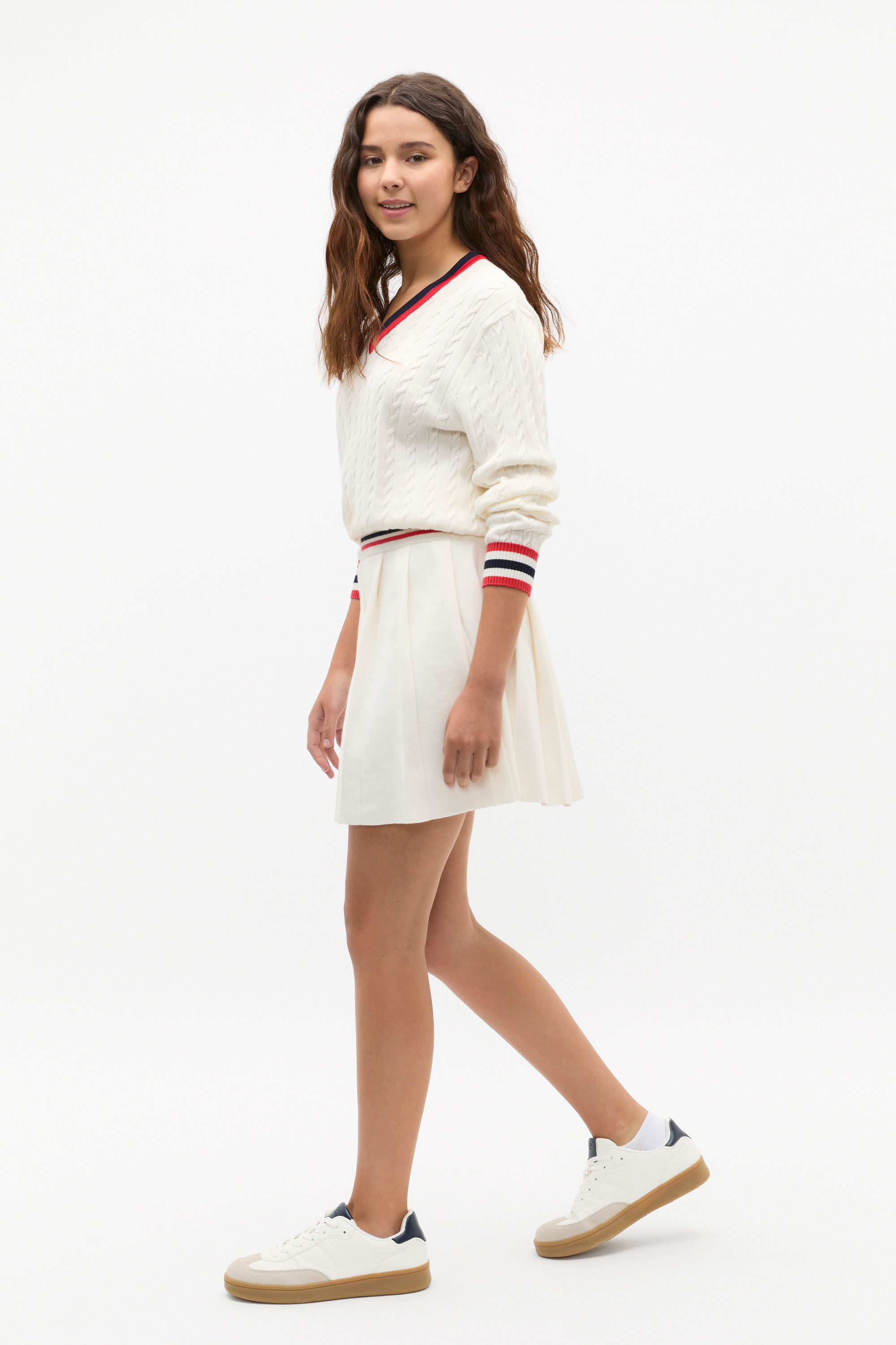 Classic in all its details, this knit sweater is ready to be worn on repeat. It features a V-neck and long sleeves with contrast trims and a relaxed fit. Crafted in premium cotton, it offers all-day comfort. Style with the coordinating pleated skirt for a chic sporting head-to-toe set.
