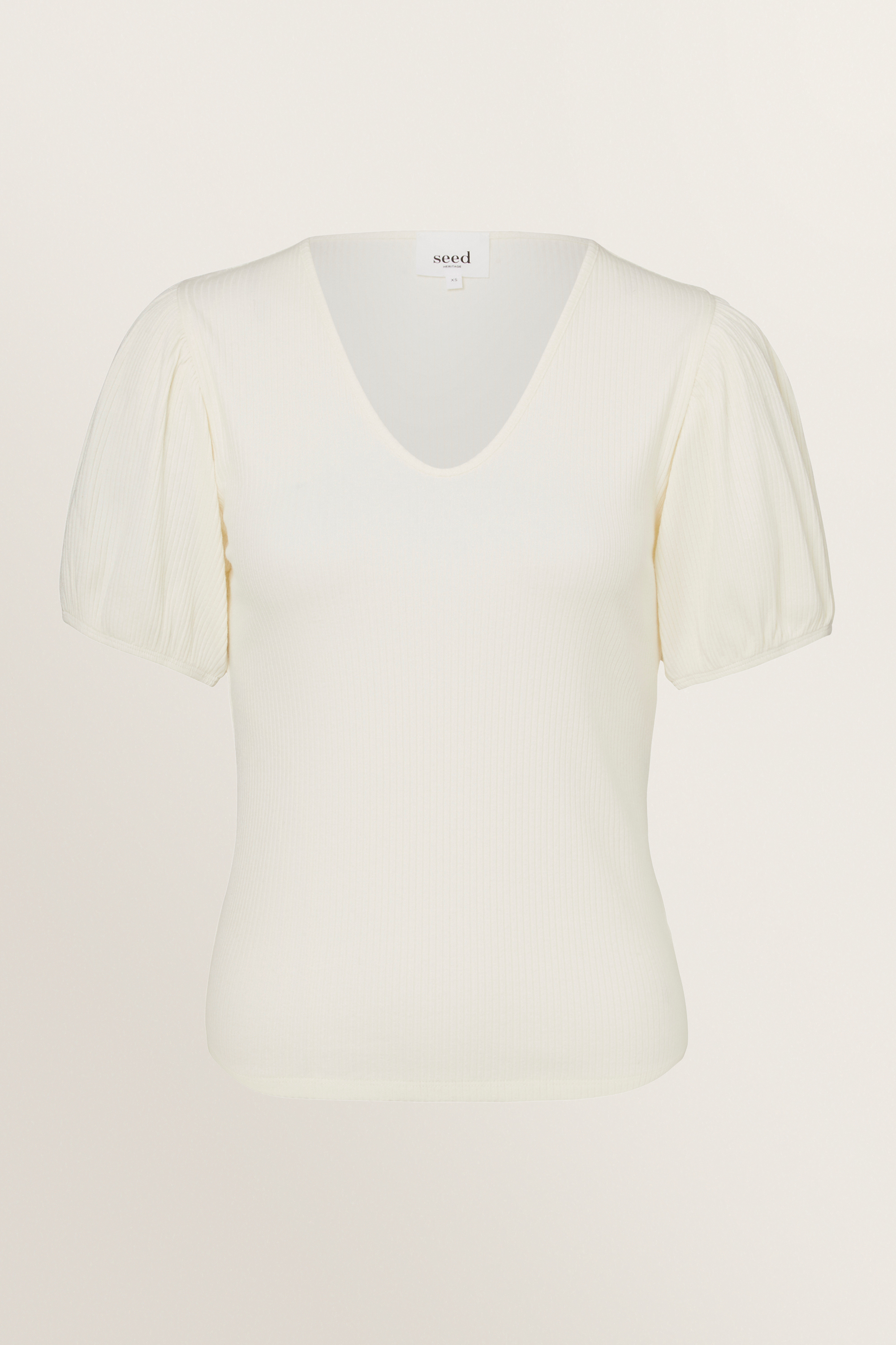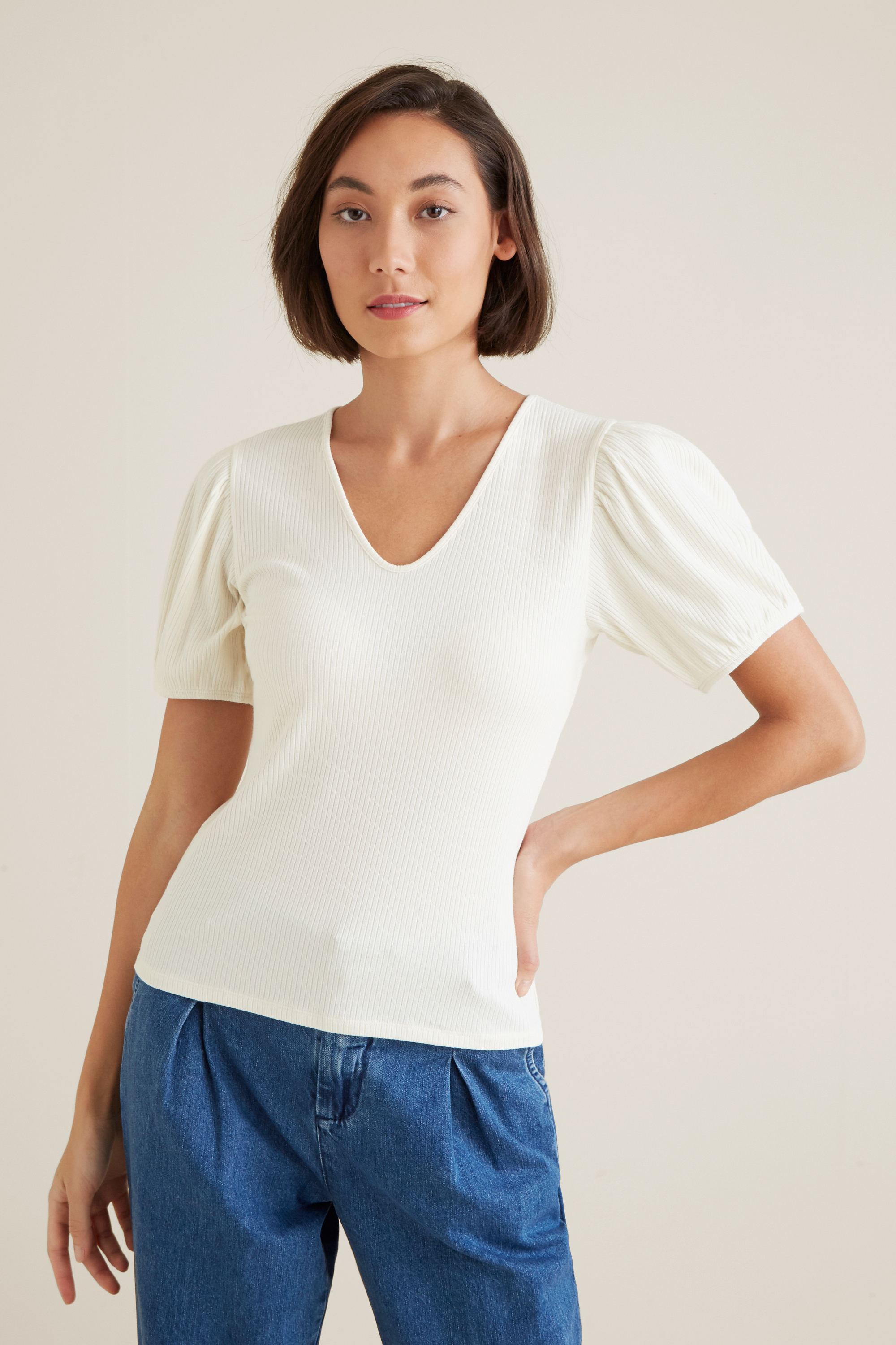 Boasting a modern romantic vibe, this V Neck Rib Sleeve Top is detailed with a plunging neckline.