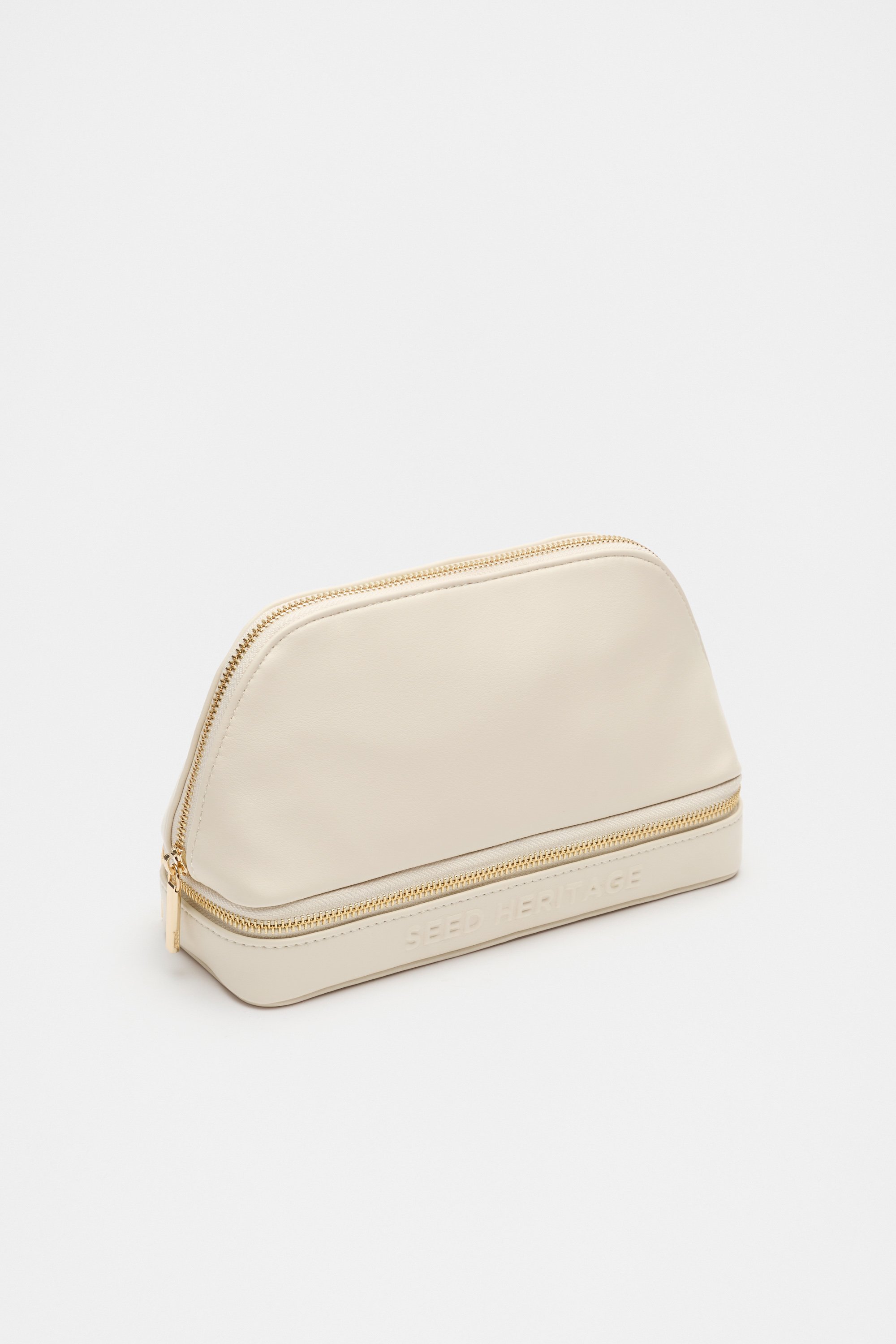 This chic vanity case is perfect for travel and makes a great gift. It features two main sections: the top section has a pocket on the back wall and the bottom section has jewellery compartments and a mirror.