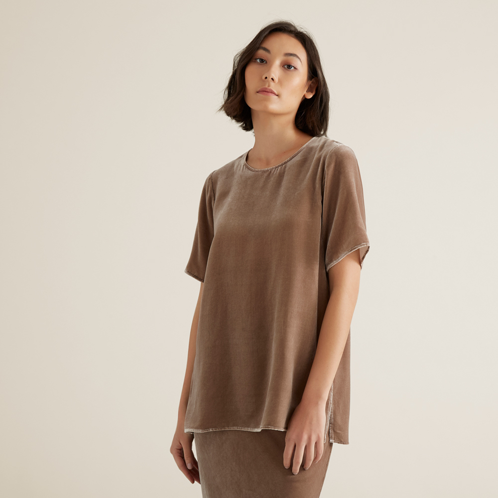 The Velvet Top features a soft textured body, oversized longline hem, drop shoulder short sleeve, and circle neckline. Perfectly paired with the Seed Velvet Slip Skirt, this co-ord will elevate your style. The Velvet Top is made from a lightweight single lined Silk/Viscose blend, available in sizes 6 through to 14. Our model wears a size 8 and is 176cm tall. Care instructions can be found inside of the garment.