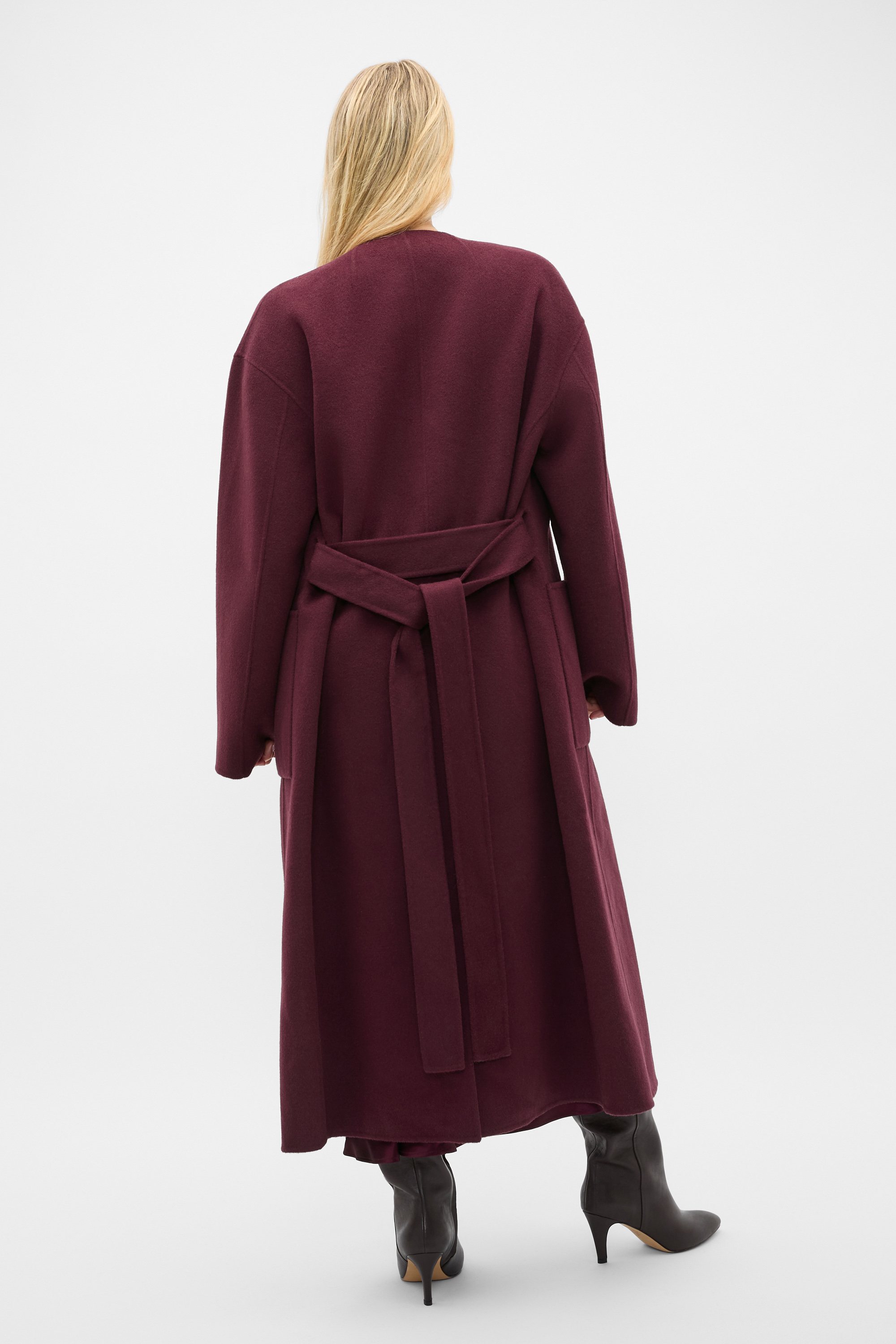 Embrace the shifting seasons in this refined design. Crafted in a wool blend to greet the cool change, it features a collarless round neck, long sleeves and a statement button placket. It falls to a midi length with a flattering silhouette securing with a belt tie around the middle.