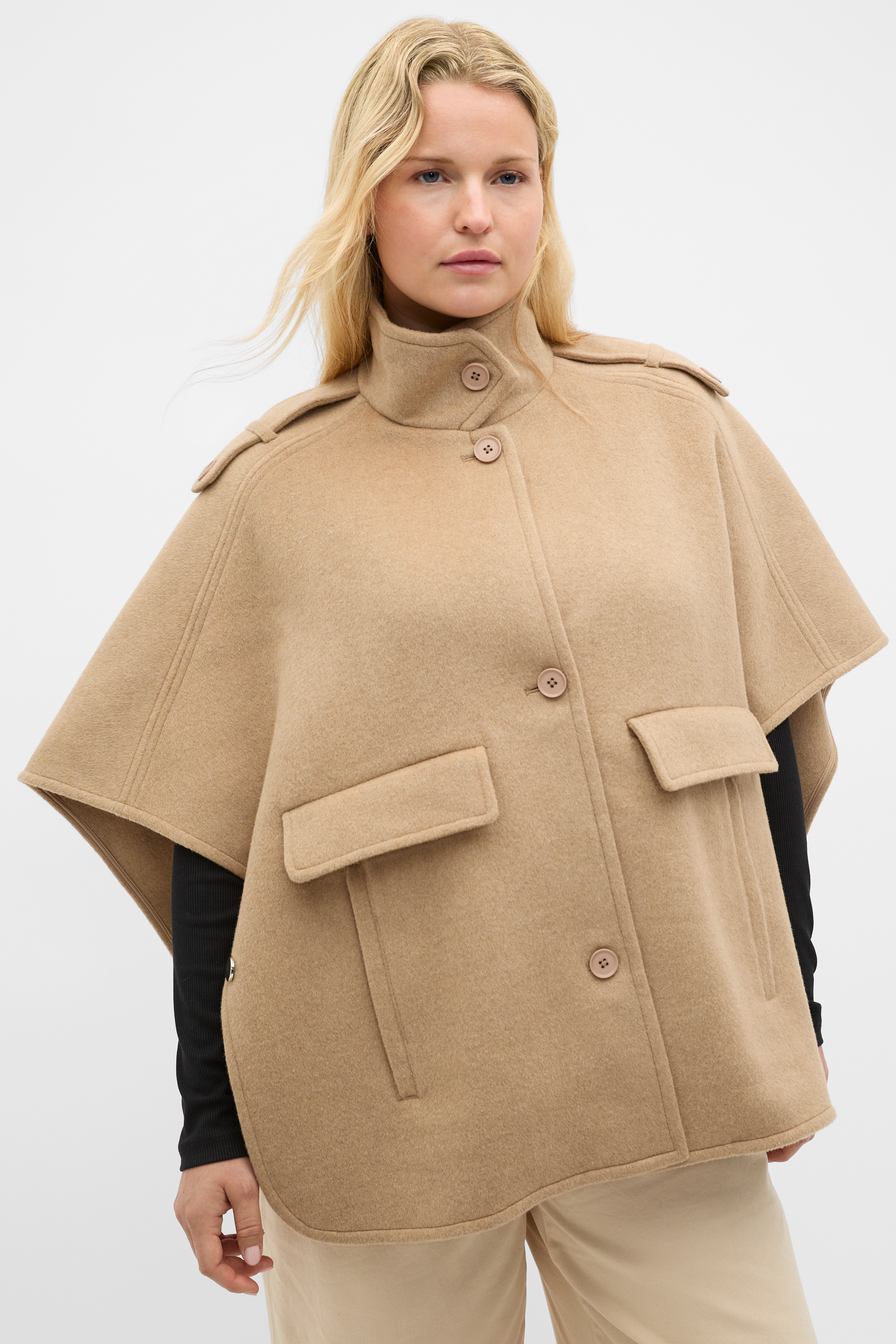 A chic layer for the cooler weather, this trench cape is finished in a soft wool blend. It features a high collar with a button detail, a button-through front, epaulets and front pockets. It secures at the sides with press studs.