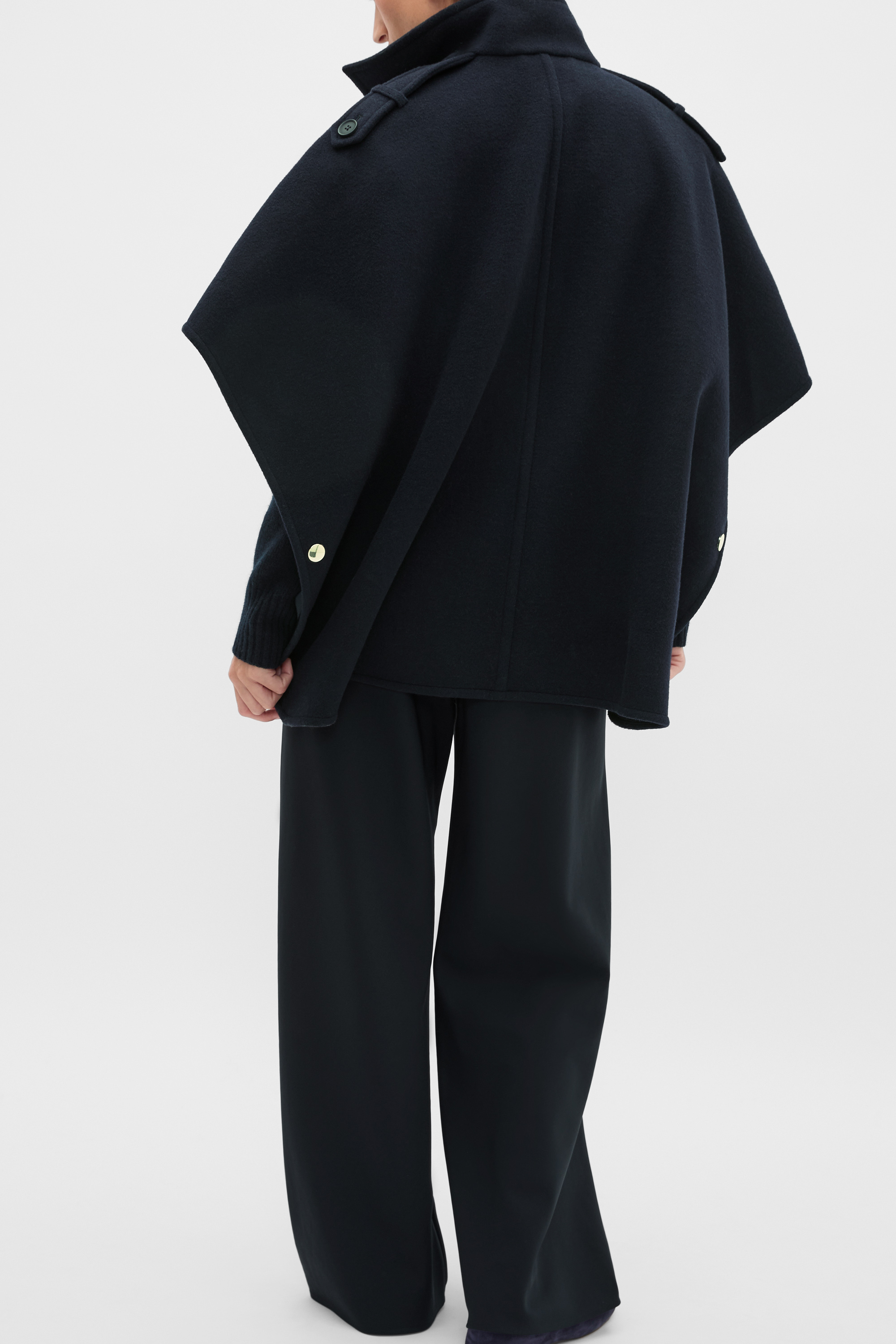 A chic layer for the cooler weather, this trench cape is finished in a soft wool blend. It features a high collar with a button detail, a button-through front, epaulets and front pockets. It secures at the sides with press studs.