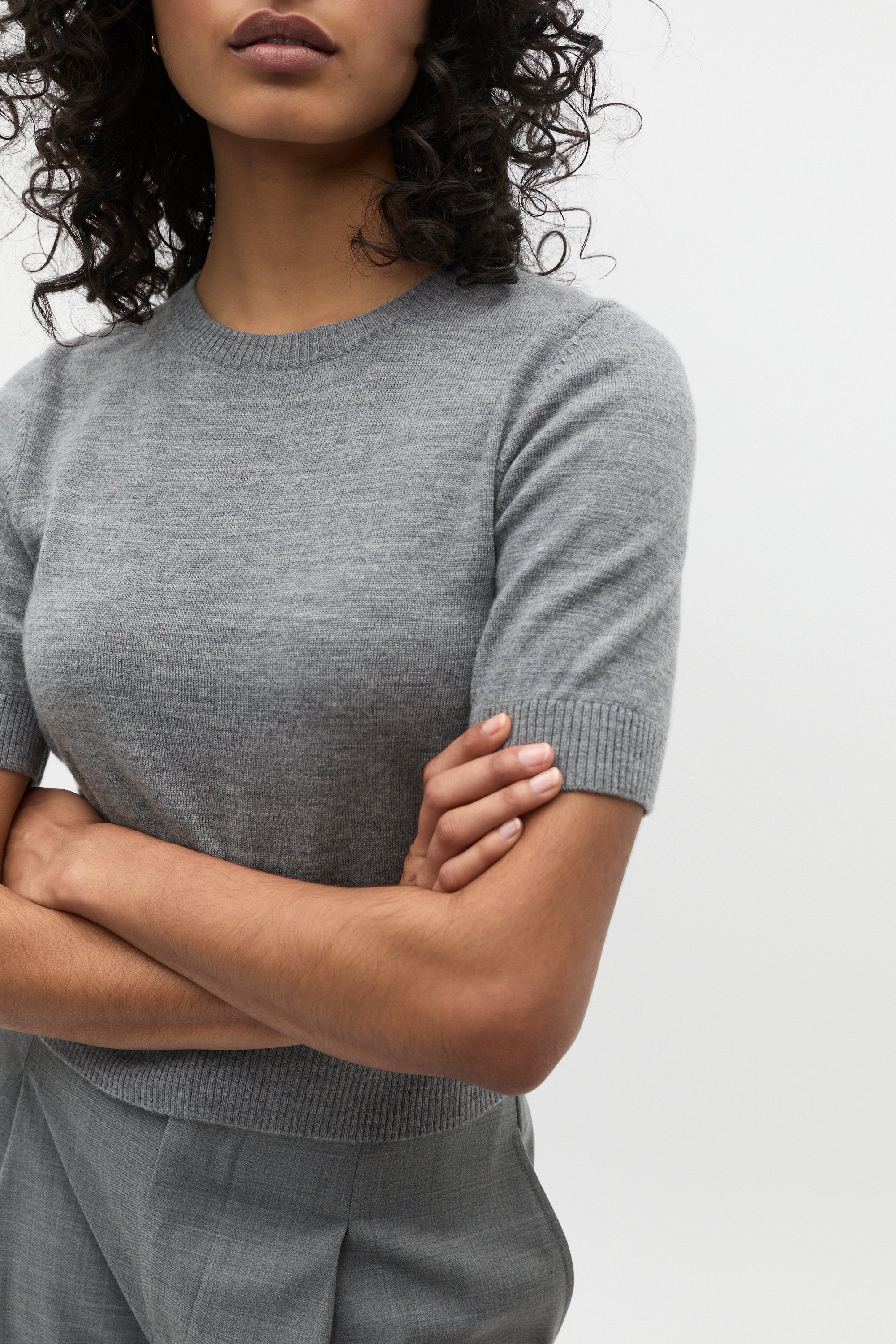 An essential in luxe Merino wool, this crew neck tee elevates a classic style and is set to be a new wardrobe staple. It features a round neck, short sleeves and ribbed trims.