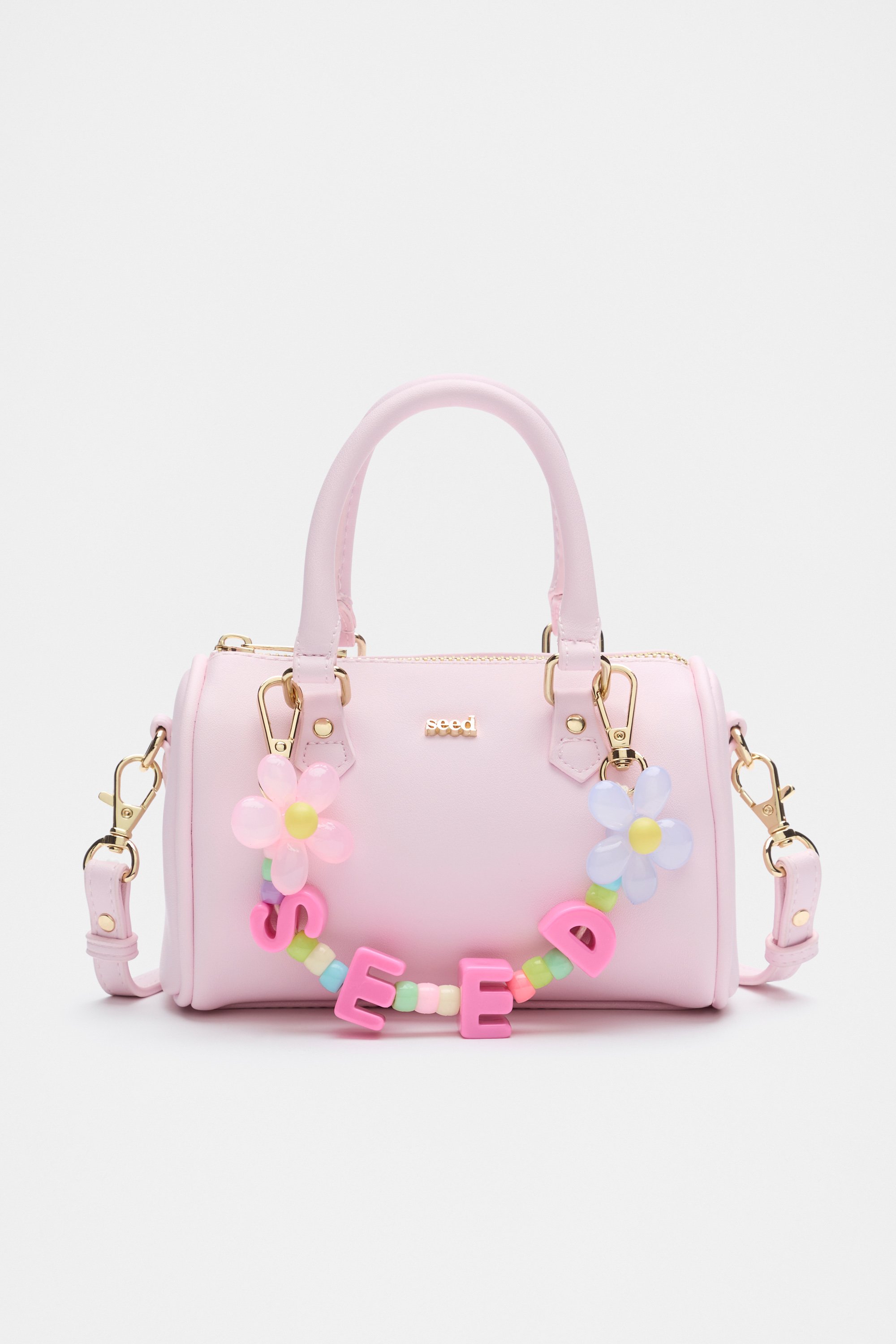 Bright and playful, this charm attaches to a bag and features a beaded flower design.