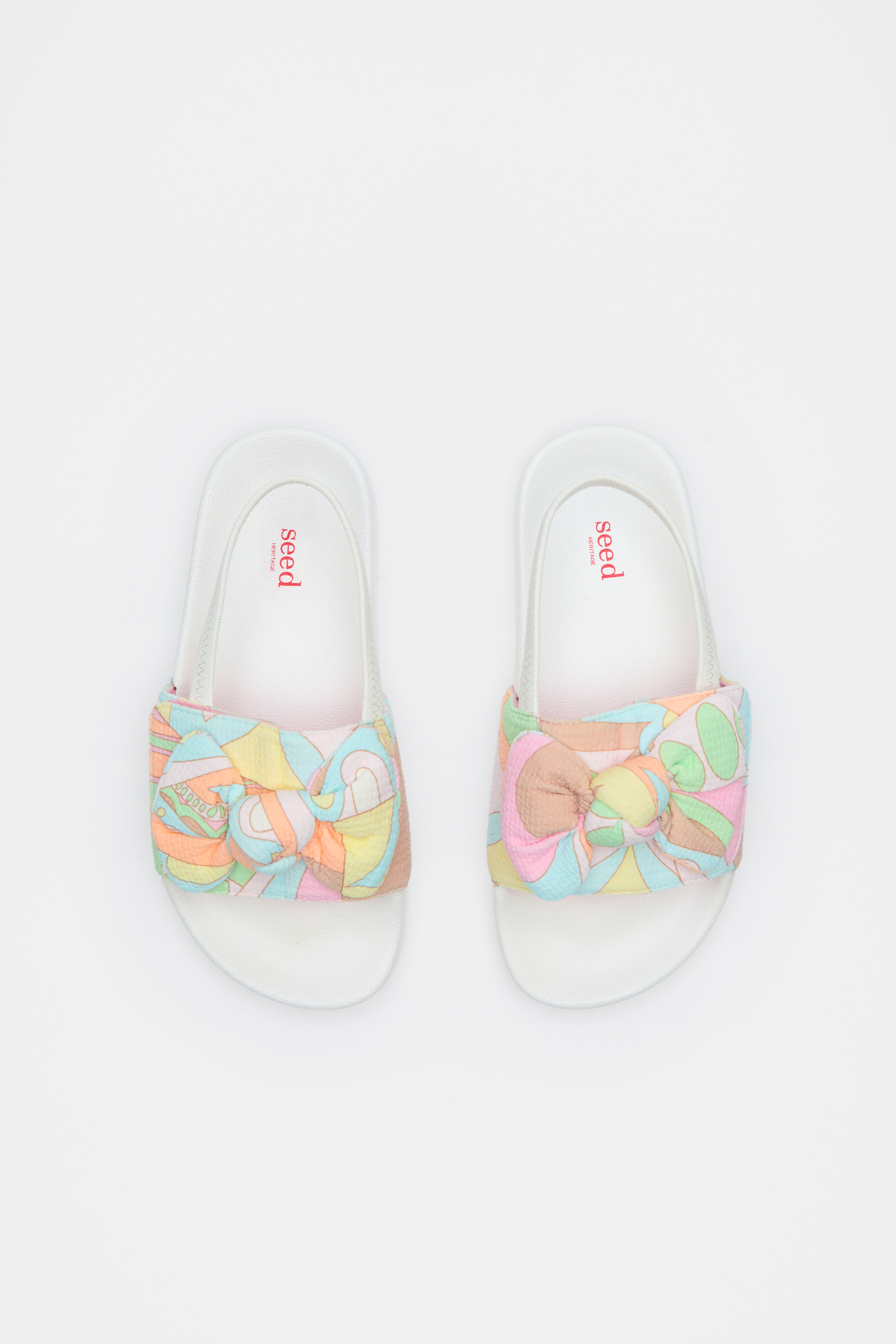 These adorable pool slides add some colour to her summer look. They're a slide-on style with an elastic sling back and a bow on top. Designed to match our paisley apparel and swimwear styles.