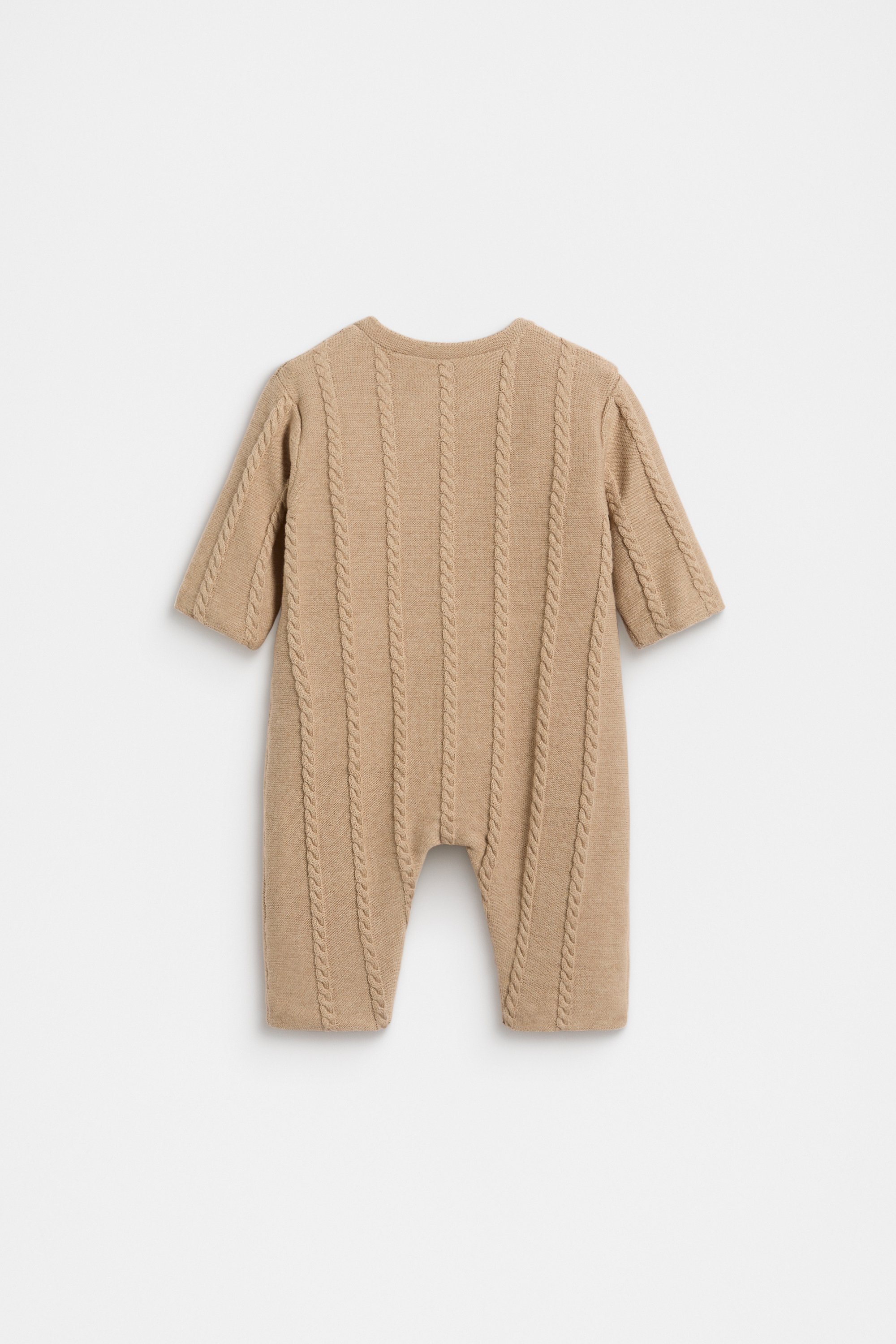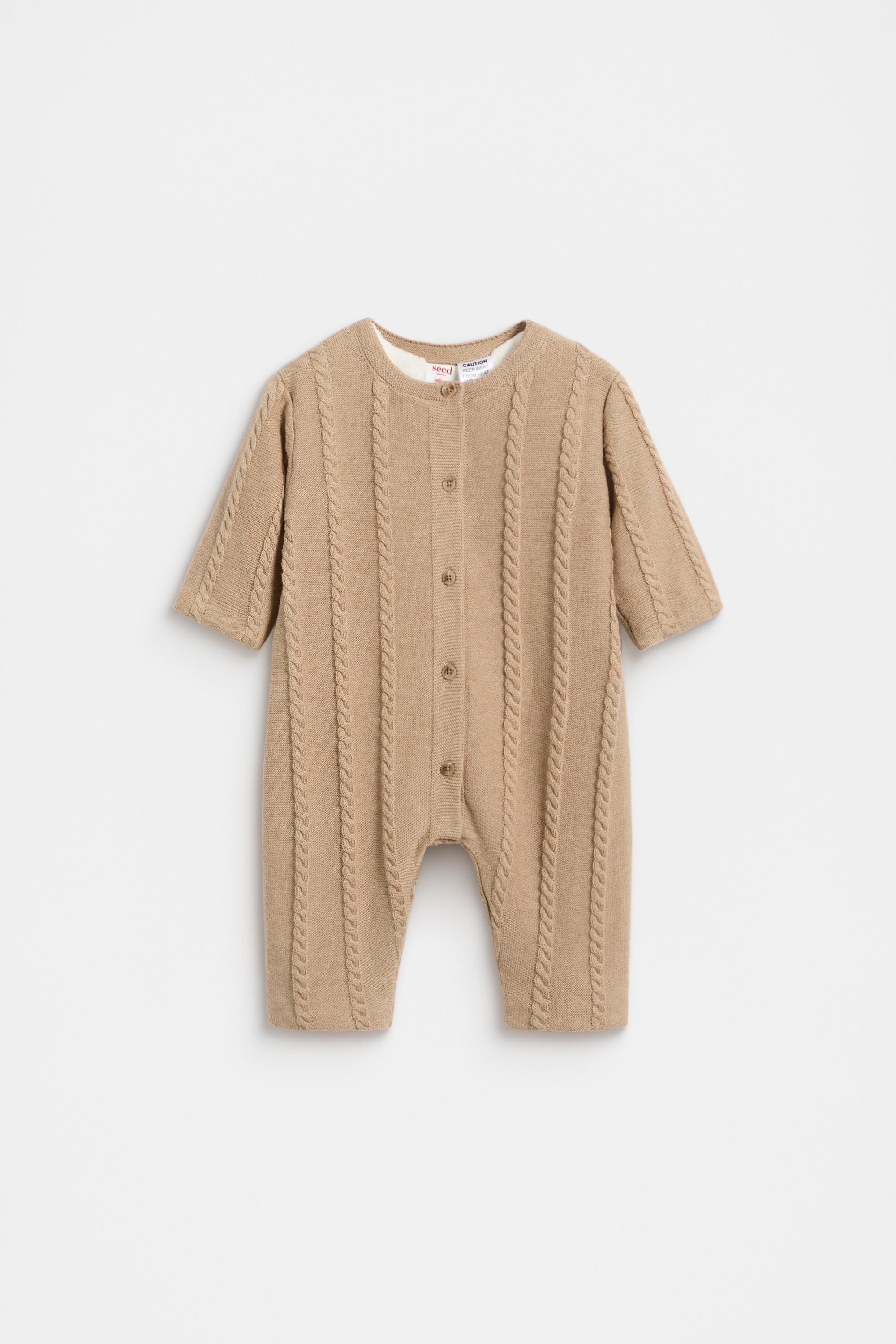 The ultimate cuddly coveralls, this cable knit style will keep your little one cosy and warm. With the softest plush lining, it features a round neck, long sleeves and a button-through front. These coveralls are crafted in a cotton blend, softened with cashmere for a luxury feel. Pair with the matching beanie for the cutest winter set, or for the perfect gift.