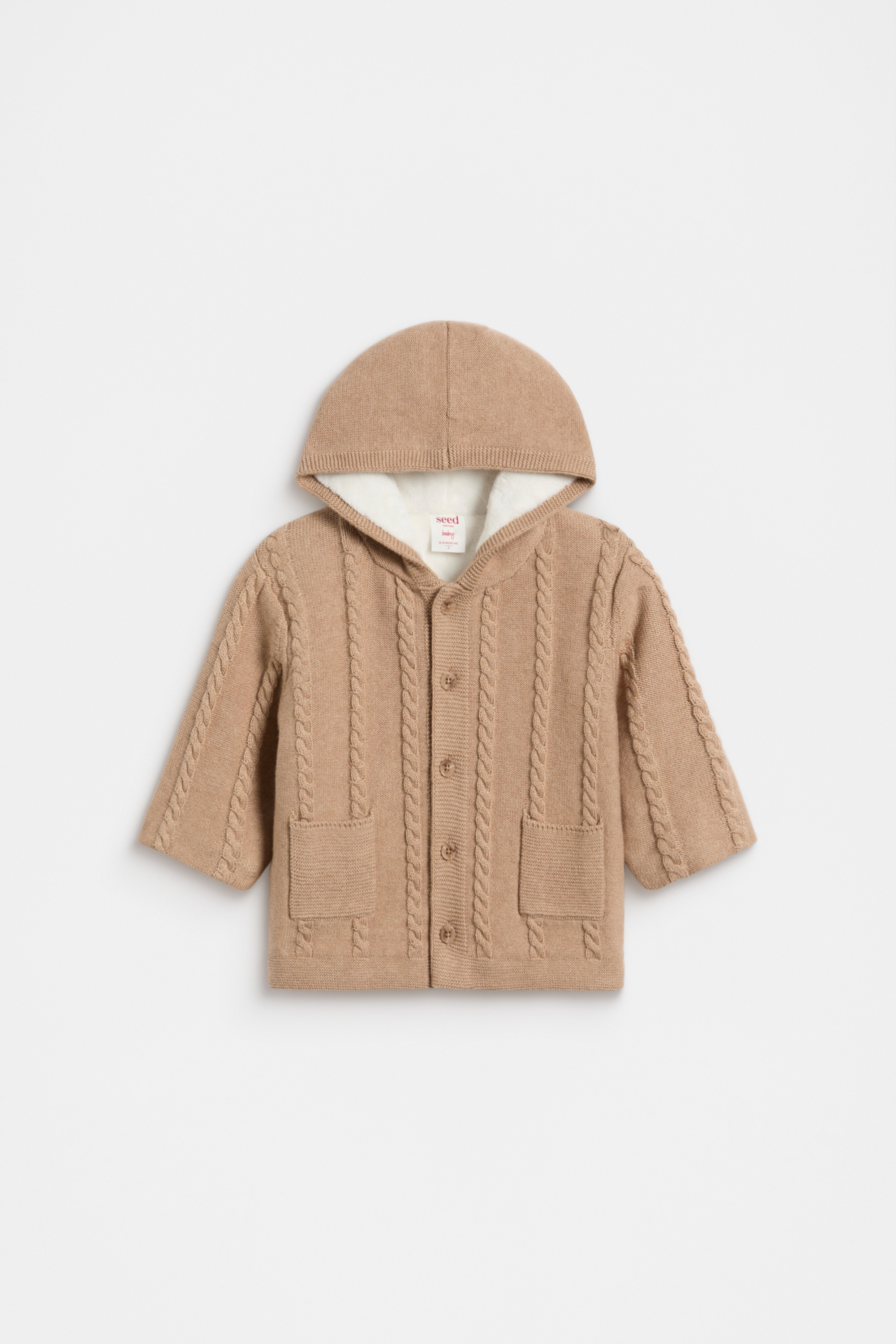 Cuddly and cosy, this jacket is set to become a new favourite for your little love. With an ultra-soft plush lining, it features a hood, long sleeves, a button front, pockets and is finished in a cable knit. This jacket is crafted in a cotton blend, softened with cashmere for a luxury feel. Pair with the matching beanie for the cutest winter set, or for the perfect gift.
