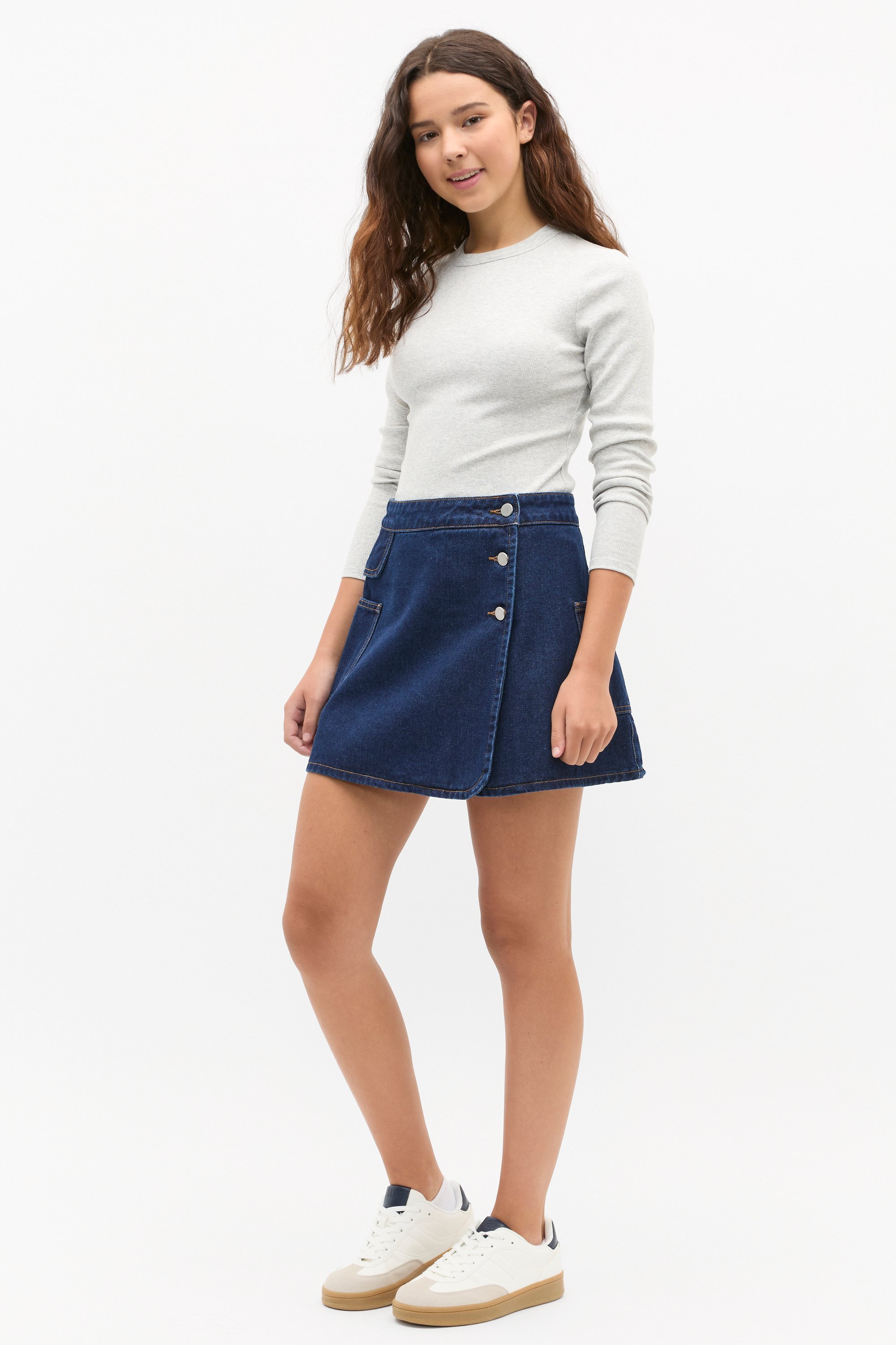 This denim skirt is a classic style with a modern edge. Crafted in premium cotton, it features a fixed waistband with a wrap front that secures with metallic buttons. It falls to a mini length and has cargo pockets.