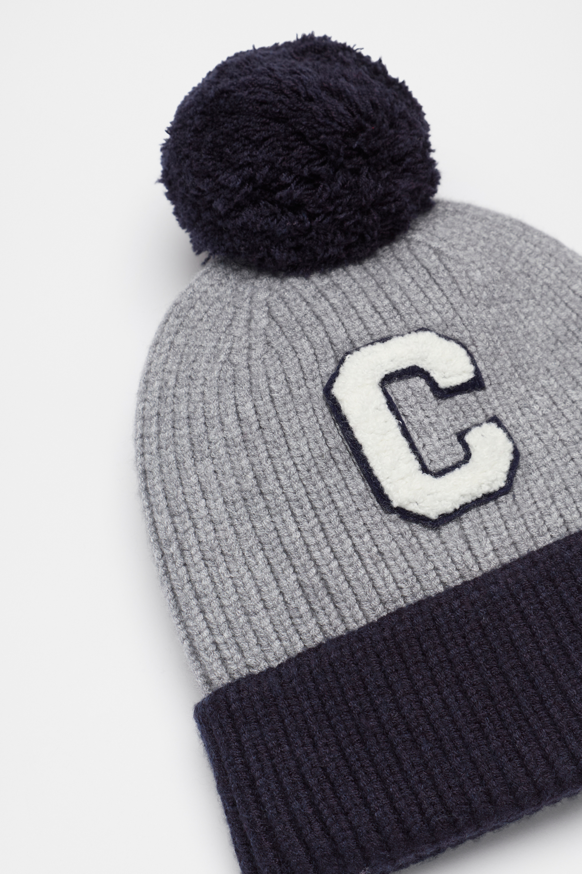 A cool and on-trend style, this colourblock beanie features a pom pom and a chenille initial patch.