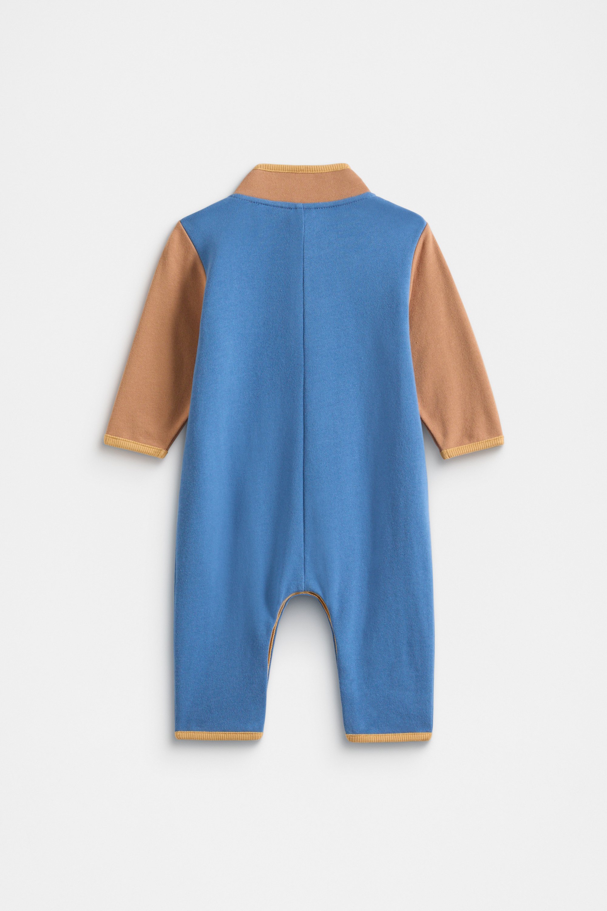 The cosiest design, this jumpsuit will make your little love cuddlier than ever. Crafted in premium cotton, this jumpsuit features a colourblock design with contrast sleeves and collar. It has a high collar with a button-up detail and contrast trims. Designed as a mini racing suit, it features a playful embroidered racing patch with a too-cute smiling trophy.