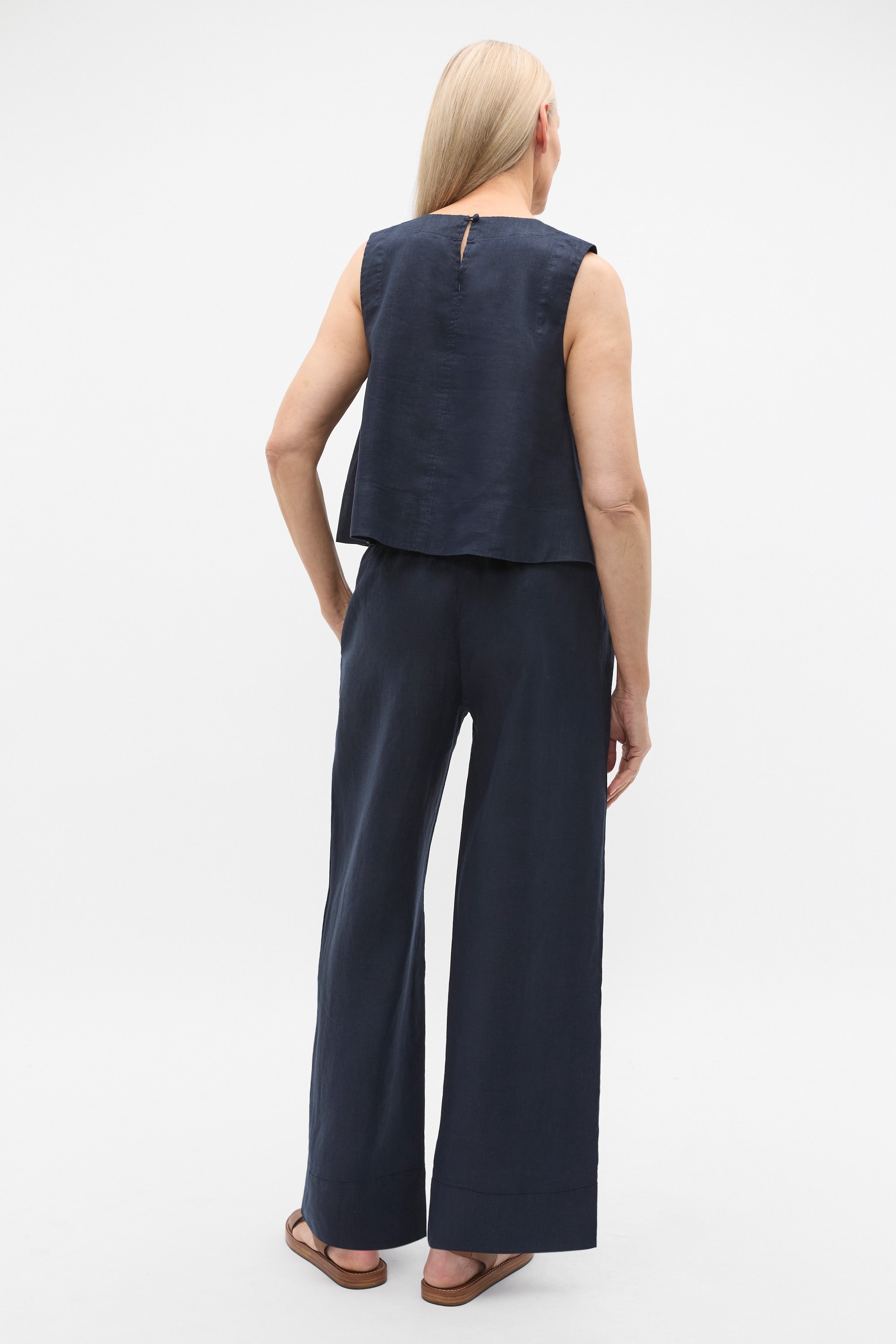 An update on a classic, this shell top is an essential for the warmer weather. Crafted in pure linen, it's a sleeveless design and features a round neck, a loose fitting swing cut and secures with a loop button at the back of the neck. Style with our coordinating linen pieces for effortless tonal styling.
