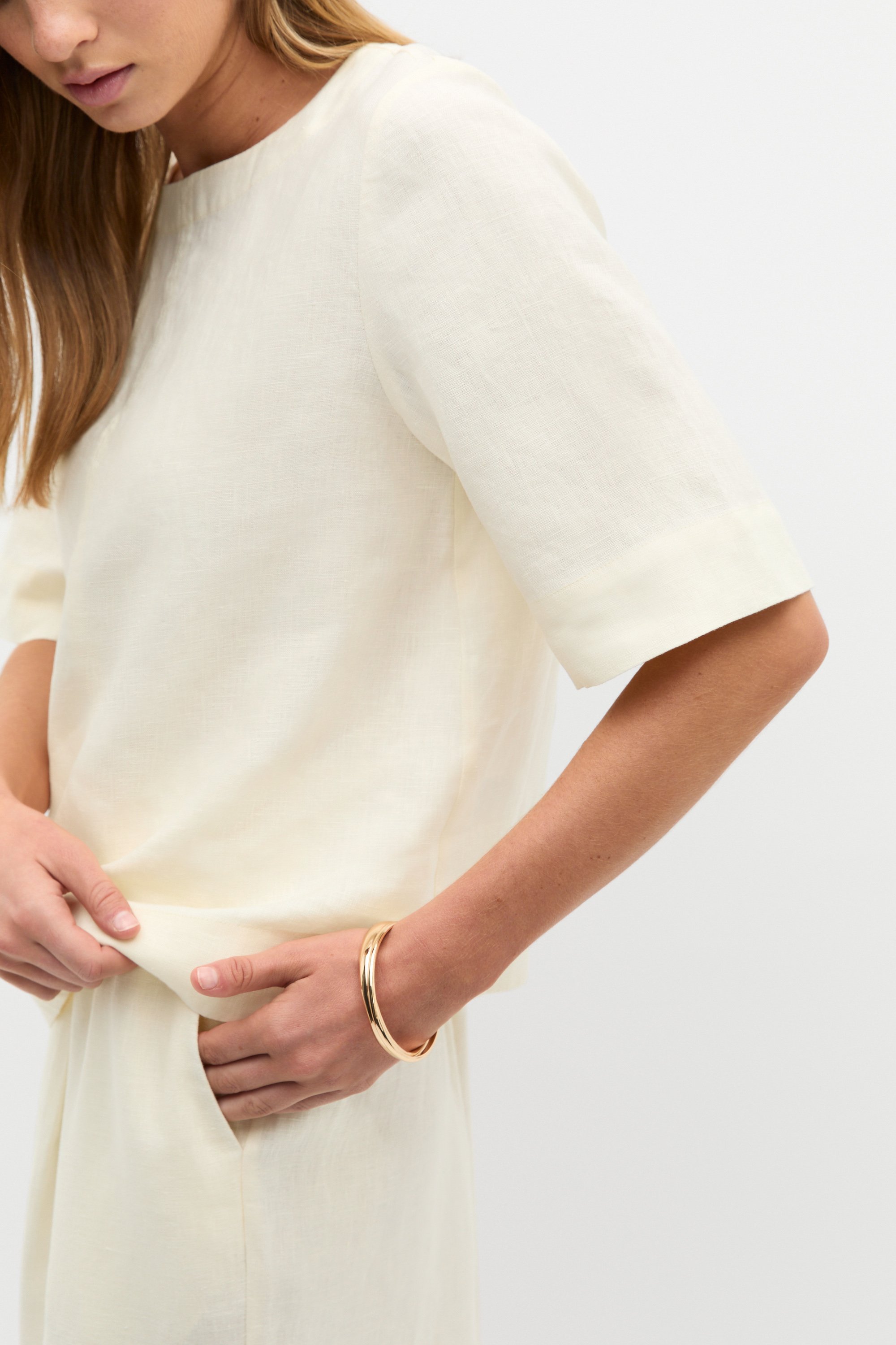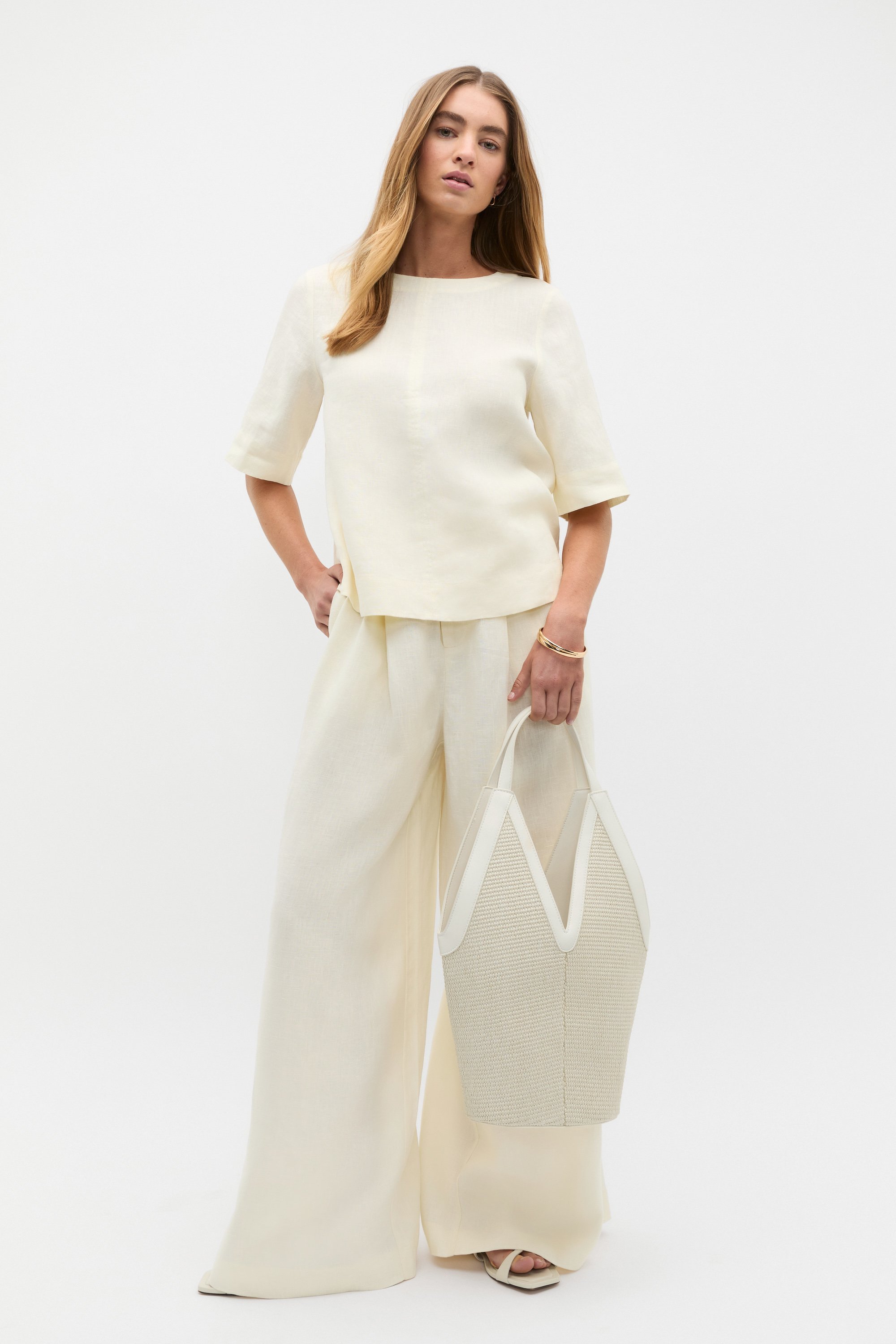 A premium essential in your everyday wardrobe, this tee is crafted in pure linen for an effortlessly elevated look. It features a round neck, short sleeves, a relaxed fit and secures with a button at the back of the neck. Style with the coordinating linen pieces for a chic tonal set, or pair with your favourite jeans for your day-to-day casual.