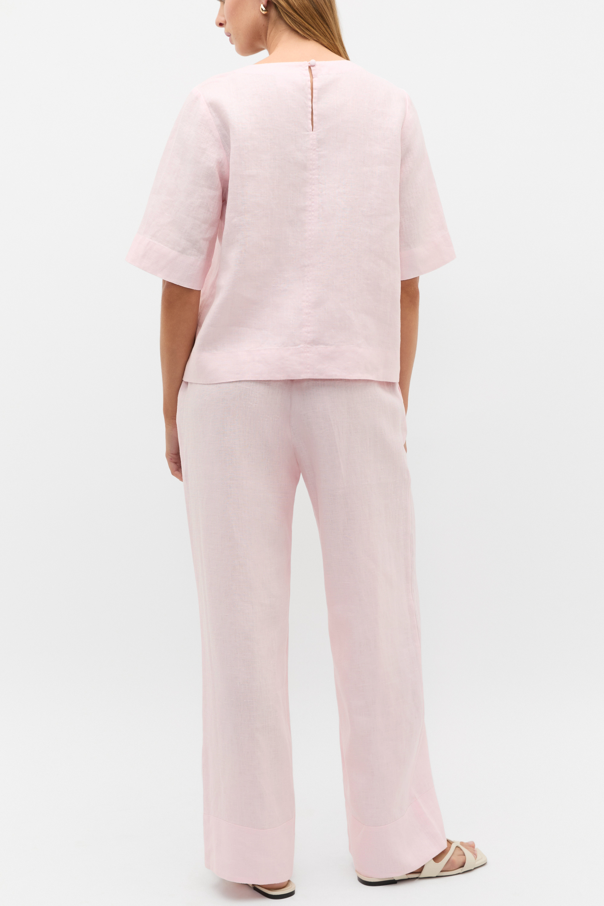 A premium essential in your everyday wardrobe, this tee is crafted in pure linen for an effortlessly elevated look. It features a round neck, short sleeves, a relaxed fit and secures with a button at the back of the neck. Style with the coordinating linen pieces for a chic tonal set, or pair with your favourite jeans for your day-to-day casual.