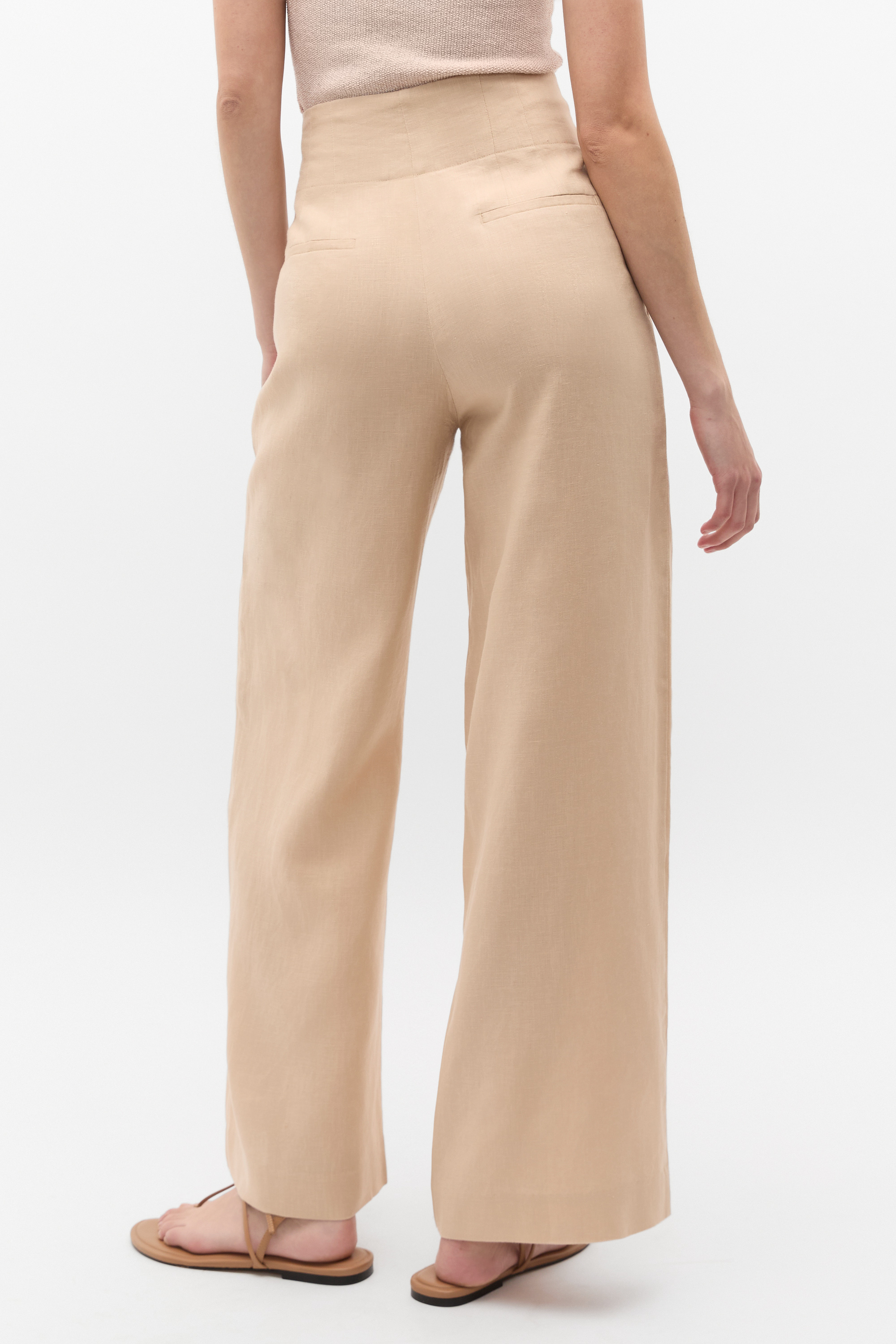 Versatile and easy to style, these pants have a high, gathered waist with darting at the rear. They also feature curved side pockets, rear welt pockets, a wide leg shape, and are crafted from premium linen made with French flax.