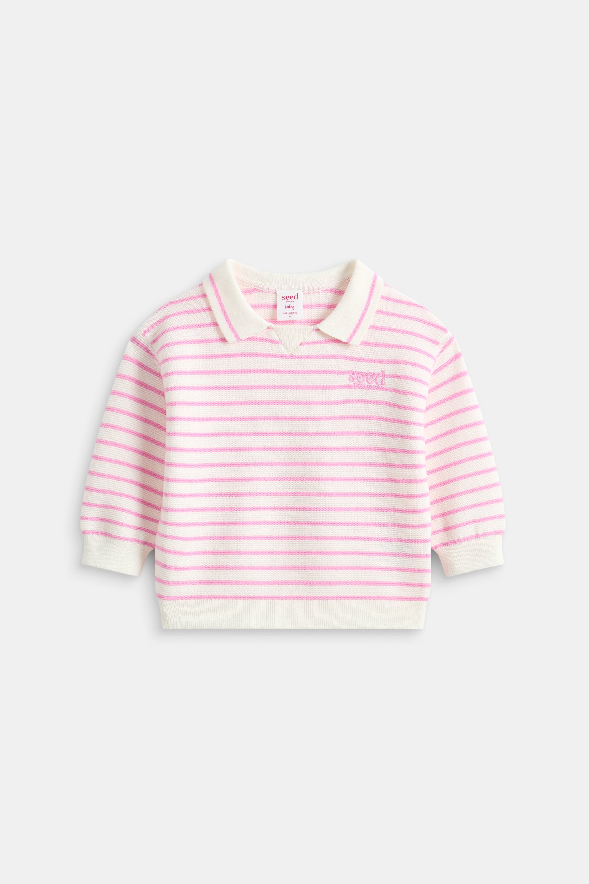 Pretty with a pink stripe design, this smart little sweater is practical and sweet. Crafted in premium cotton with a soft knit finish, it features an open collar, long sleeves with ribbed trims and an embroidered Seed Heritage logo.