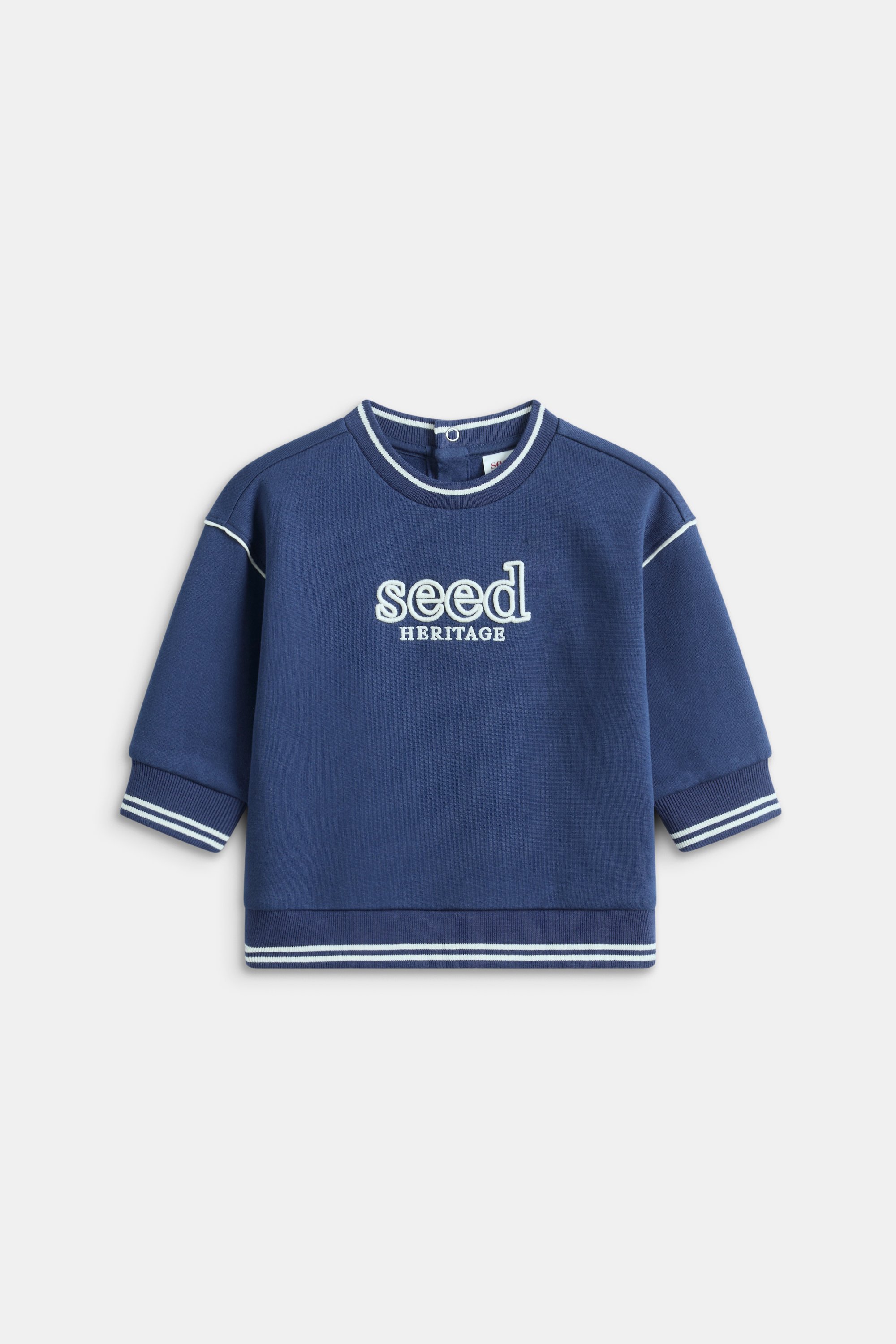 A comfortable style to add in to the rotation, this little sweater is oh so sweet. Crafted in premium cotton, it features a round neck, long sleeves and an embroidered Seed Heritage logo. It features ribbed trims with a stripe design for a classic sporty feel.