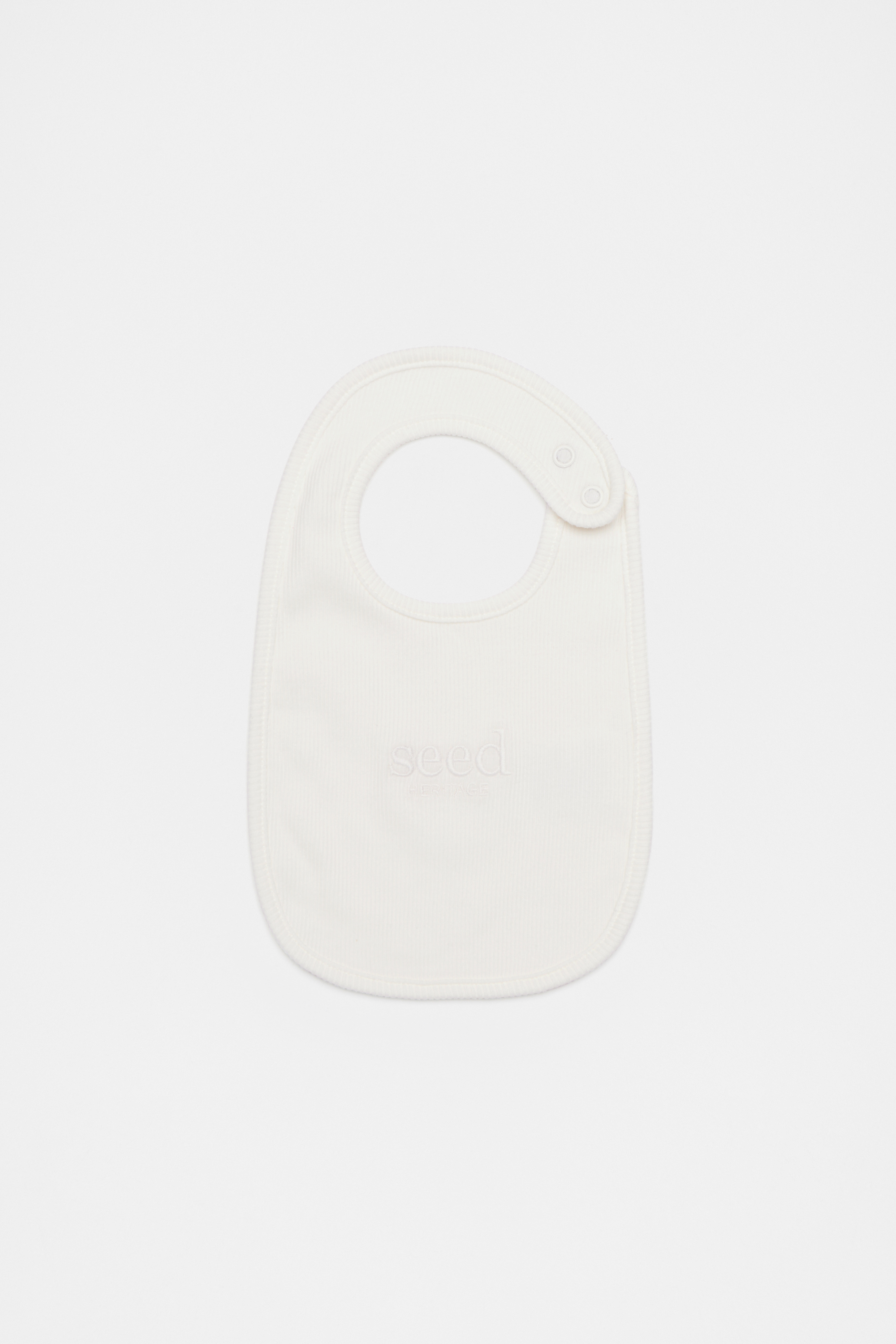 This classic bib features an embroidered Seed Heritage logo, a stripe pattern, and a rib texture. Crafted from soft stretch cotton, the bib has snap fastenings at the neck for easy changes.